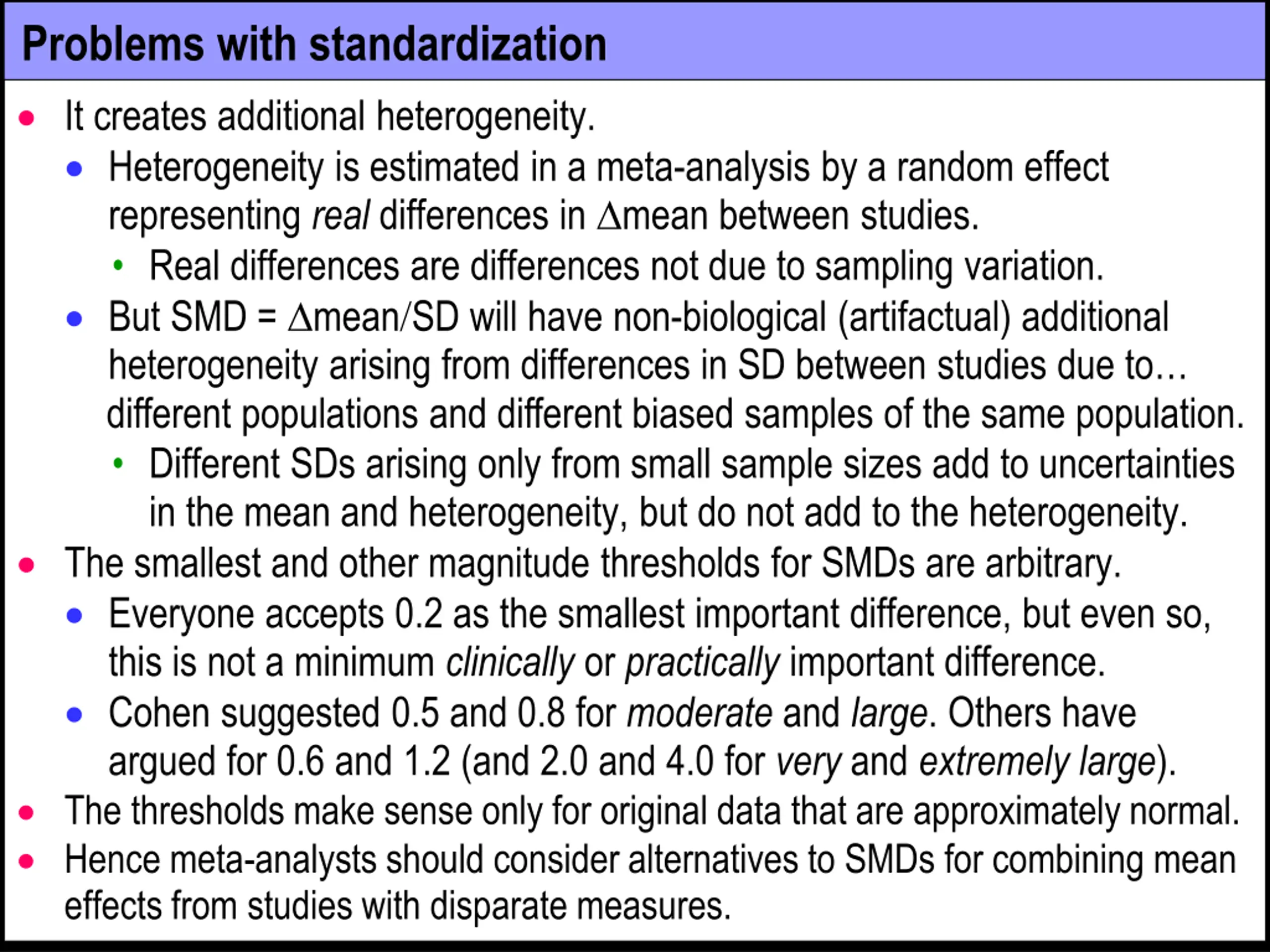 Problems with standardization It creates additional heterogeneity. Heterogeneity is estimated in a meta-analysis by a random effect representing real differences in mean between studies. Real differences are differences not due to sampling variation. But SMD = mean SD will have non-biological (artifactual) additional heterogeneity arising from differences in SD between studies due to different populations and different biased samples of the same population. Different SDs arising only from small sample sizes add to uncertainties in the mean and heterogeneity, but do not add to the heterogeneity. The smallest and other magnitude thresholds for SMDs are arbitrary. Everyone accepts 0.2 as the smallest important difference, but even so, this is not a minimum clinically or practically important difference. Cohen suggested 0.5 and 0.8 for moderate and large. Others have argued for 0.6 and 1.2 (and 2.0 and 4.0 for very and extremely large). The thresholds make sense only for original data that are approximately normal. Hence meta-analysts should consider alternatives to SMDs for combining mean effects from studies with disparate measures.