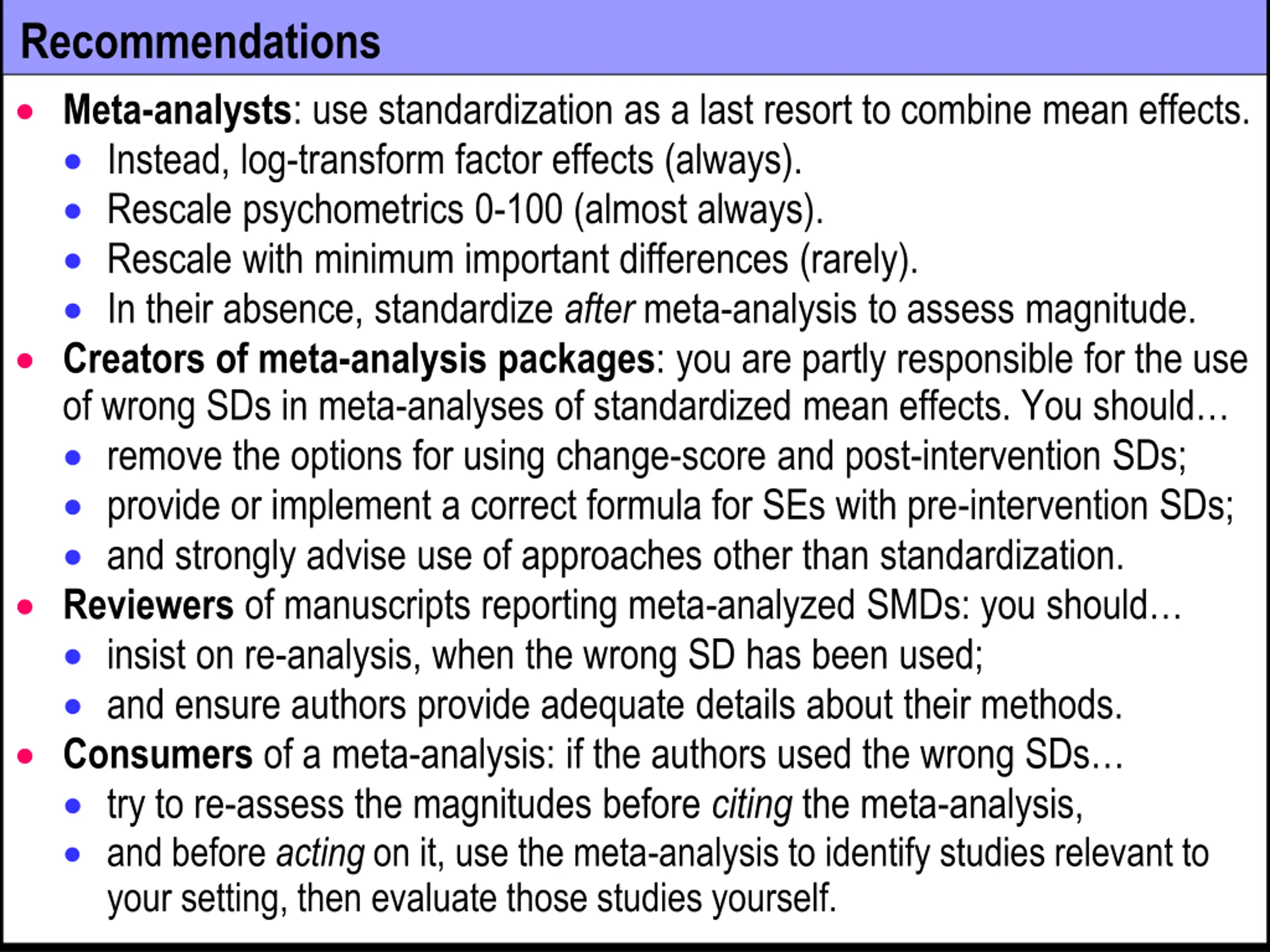 Recommendations Meta-analysts: use standardization as a last resort to combine mean effects. Instead, log-transform factor effects (always). Rescale psychometrics 0-100 (almost always). Rescale with minimum important differences (rarely). In their absence, standardize after meta-analysis to assess magnitude. Creators of meta-analysis packages: you are partly responsible for the use of wrong SDs in meta-analyses of standardized mean effects. You should remove the options for using change-score and post-intervention SDs; provide or implement a correct formula for SEs with pre-intervention SDs; and strongly advise use of approaches other than standardization. Reviewers of manuscripts reporting meta-analyzed SMDs: you should insist on re-analysis, when the wrong SD has been used; and ensure authors provide adequate details about their methods. Consumers of a meta-analysis: if the authors used the wrong SDs try to re-assess the magnitudes before citing the meta-analysis, and before acting on it, use the meta-analysis to identify studies relevant to your setting, then evaluate those studies yourself.