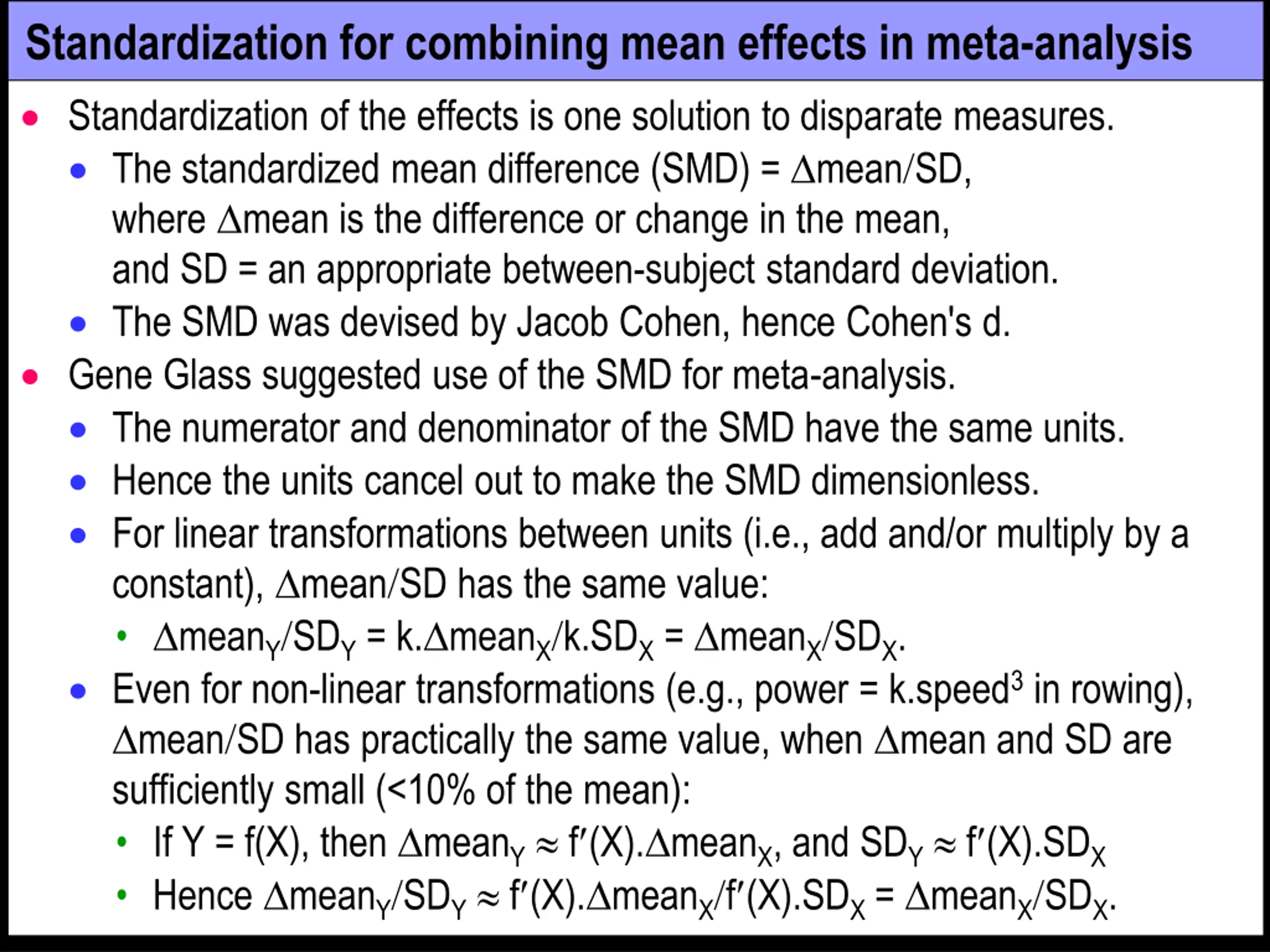 Standardization for combining mean effects in meta-analysis Standardization of the effects is one solution to disparate measures. The standardized mean difference (SMD) = mean SD, where mean is the difference or change in the mean, and SD = an appropriate between-subject standard deviation. The SMD was devised by Jacob Cohen, hence Cohen's d. Gene Glass suggested use of the SMD for meta-analysis. The numerator and denominator of the SMD have the same units. Hence the units cancel out to make the SMD dimensionless. For linear transformations between units (i.e., add and/or multiply by a constant), mean SD has the same value: meanY SDY = k. meanX k.SDX = meanX SDX. Even for non-linear transformations (e.g., power = k.speed3 in rowing), mean SD has practically the same value, when mean and SD are sufficiently small (<10% of the mean): If Y = f(X), then meanY f (X). meanX, and SDY f (X).SDX Hence meanY SDY f (X). meanX f (X).SDX = meanX SDX.