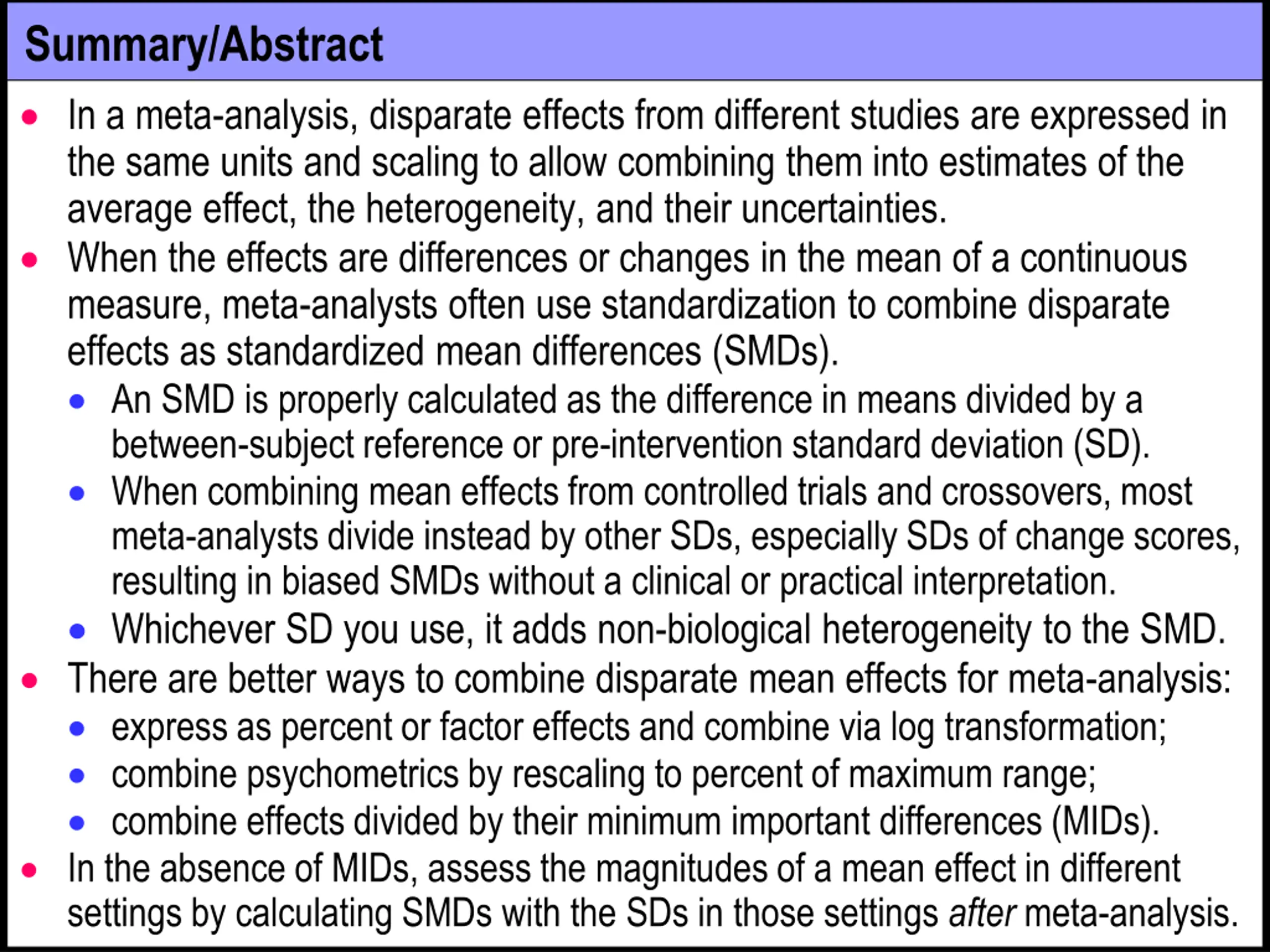 Summary/Abstract In a meta-analysis, disparate effects from different studies are expressed in the same units and scaling to allow combining them into estimates of the average effect, the heterogeneity, and their uncertainties. When the effects are differences or changes in the mean of a continuous measure, meta-analysts often use standardization to combine disparate effects as standardized mean differences (SMDs). An SMD is properly calculated as the difference in means divided by a between-subject reference or pre-intervention standard deviation (SD). When combining mean effects from controlled trials and crossovers, most meta-analysts divide instead by other SDs, especially SDs of change scores, resulting in biased SMDs without a clinical or practical interpretation. Whichever SD you use, it adds non-biological heterogeneity to the SMD. There are better ways to combine disparate mean effects for meta-analysis: express as percent or factor effects and combine via log transformation; combine psychometrics by rescaling to percent of maximum range; combine effects divided by their minimum important differences (MIDs). In the absence of MIDs, assess the magnitudes of a mean effect in different settings by calculating SMDs with the SDs in those settings after meta-analysis.