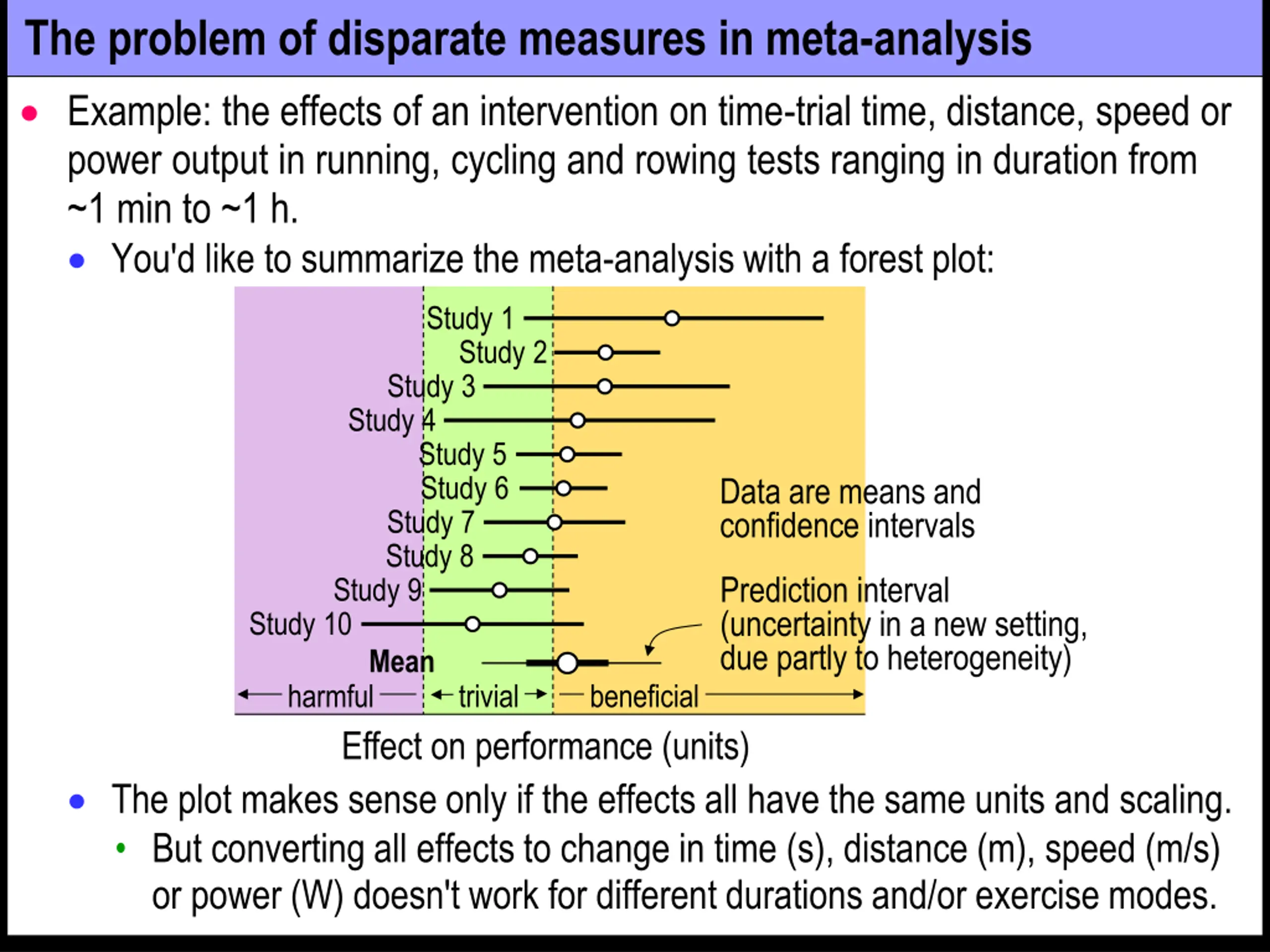 The problem of disparate measures in meta-analysis Example: the effects of an intervention on time-trial time, distance, speed or power output in running, cycling and rowing tests ranging in duration from ~1 min to ~1 h. You'd like to summarize the meta-analysis with a forest plot: Study 1 Study 2 Study 3 Study 4 Study 5 Study 6 Study 7 Data are means and confidence intervals Study 8 Prediction interval (uncertainty in a new setting, due partly to heterogeneity) Study 9 Study 10 Mean harmful trivial beneficial Effect on performance (units) The plot makes sense only if the effects all have the same units and scaling. But converting all effects to change in time (s), distance (m), speed (m/s) or power (W) doesn't work for different durations and/or exercise modes.