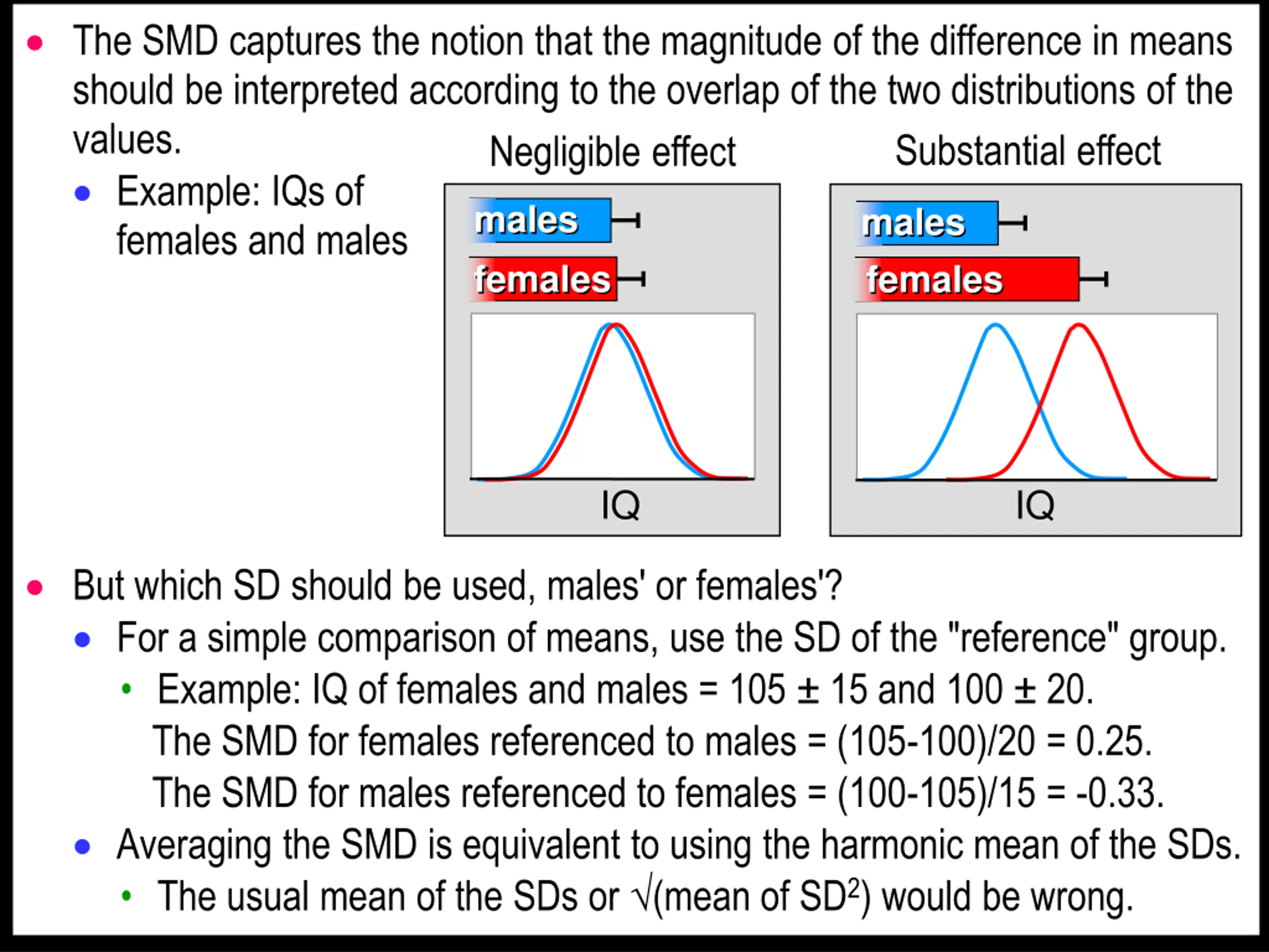 The SMD captures the notion that the magnitude of the difference in means should be interpreted according to the overlap of the two distributions of the values. Example: IQs of females and males females Substantial effect Negligible effect males males females IQ IQ But which SD should be used, males' or females'? For a simple comparison of means, use the SD of the "reference" group. Example: IQ of females and males = 105 15 and 100 20. The SMD for females referenced to males = (105-100)/20 = 0.25. The SMD for males referenced to females = (100-105)/15 = -0.33. Averaging the SMD is equivalent to using the harmonic mean of the SDs. The usual mean of the SDs or (mean of SD2) would be wrong.
