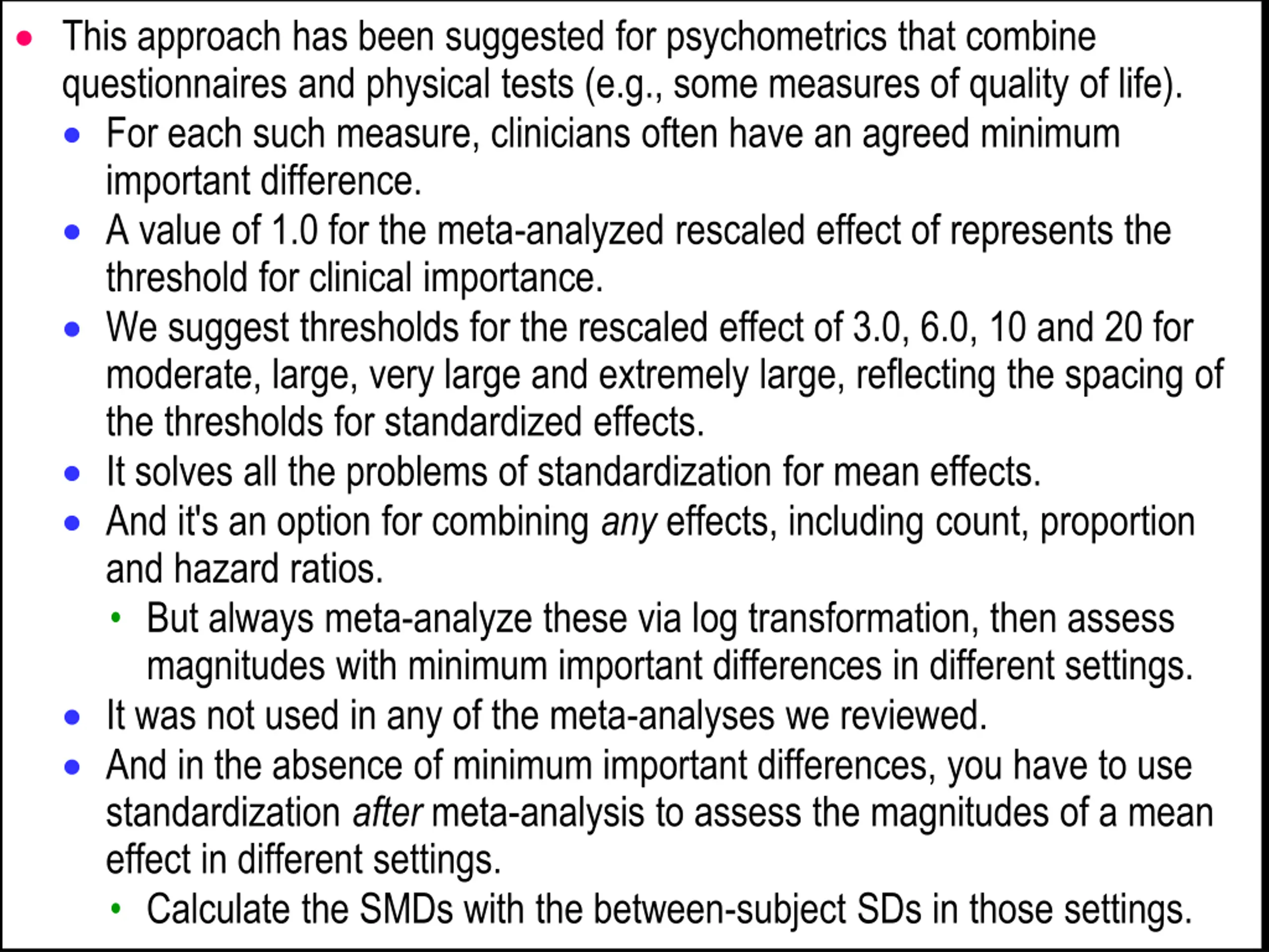 This approach has been suggested for psychometrics that combine questionnaires and physical tests (e.g., some measures of quality of life). For each such measure, clinicians often have an agreed minimum important difference. A value of 1.0 for the meta-analyzed rescaled effect of represents the threshold for clinical importance. We suggest thresholds for the rescaled effect of 3.0, 6.0, 10 and 20 for moderate, large, very large and extremely large, reflecting the spacing of the thresholds for standardized effects. It solves all the problems of standardization for mean effects. And it's an option for combining any effects, including count, proportion and hazard ratios. But always meta-analyze these via log transformation, then assess magnitudes with minimum important differences in different settings. It was not used in any of the meta-analyses we reviewed. And in the absence of minimum important differences, you have to use standardization after meta-analysis to assess the magnitudes of a mean effect in different settings. Calculate the SMDs with the between-subject SDs in those settings.
