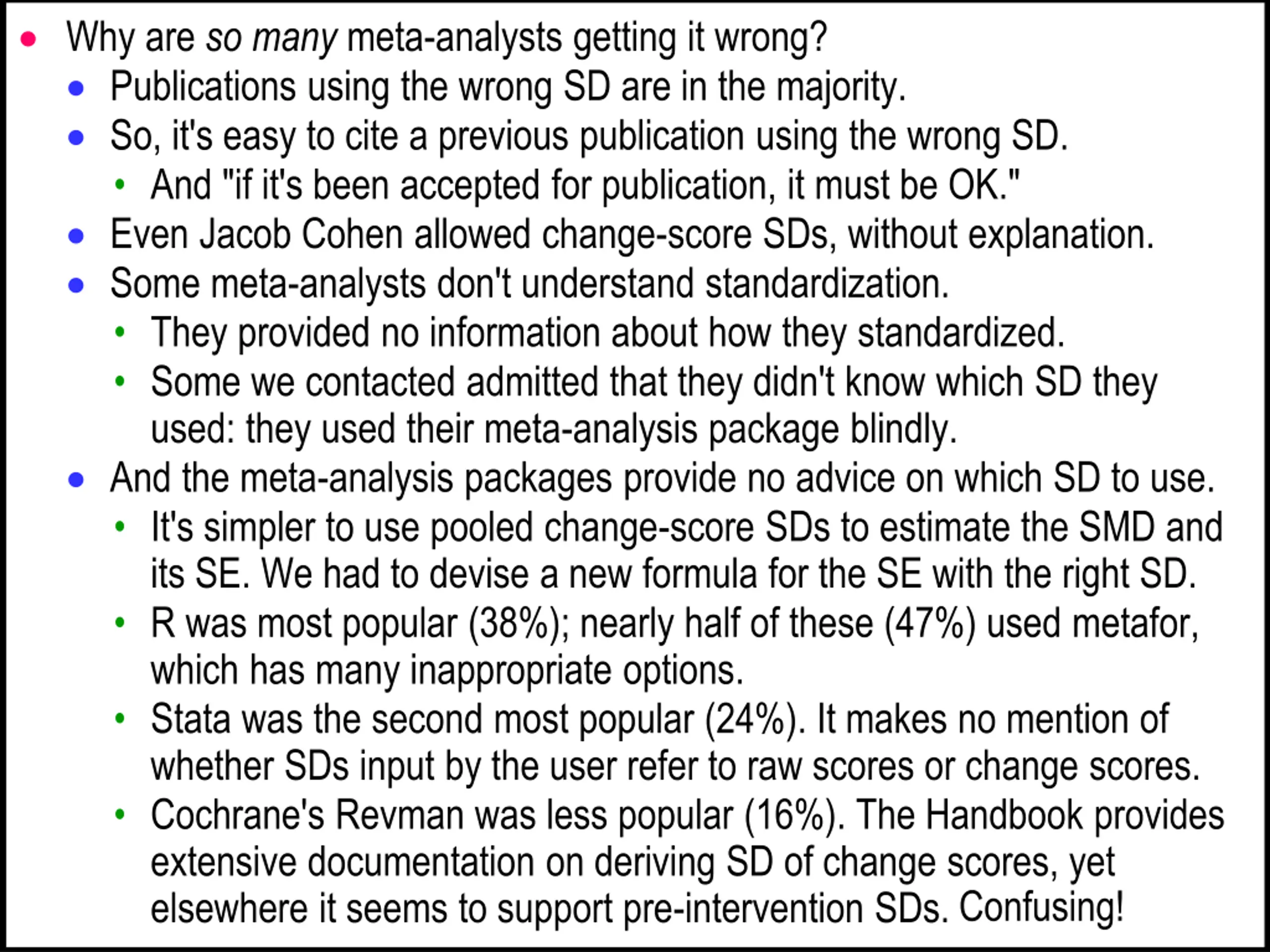 Why are so many meta-analysts getting it wrong? Publications using the wrong SD are in the majority. So, it's easy to cite a previous publication using the wrong SD. And "if it's been accepted for publication, it must be OK." Even Jacob Cohen allowed change-score SDs, without explanation. Some meta-analysts don't understand standardization. They provided no information about how they standardized. Some we contacted admitted that they didn't know which SD they used: they used their meta-analysis package blindly. And the meta-analysis packages provide no advice on which SD to use. It's simpler to use pooled change-score SDs to estimate the SMD and its SE. We had to devise a new formula for the SE with the right SD. R was most popular (38%); nearly half of these (47%) used metafor, which has many inappropriate options. Stata was the second most popular (24%). It makes no mention of whether SDs input by the user refer to raw scores or change scores. Cochrane's Revman was less popular (16%). The Handbook provides extensive documentation on deriving SD of change scores, yet elsewhere it seems to support pre-intervention SDs. Confusing!