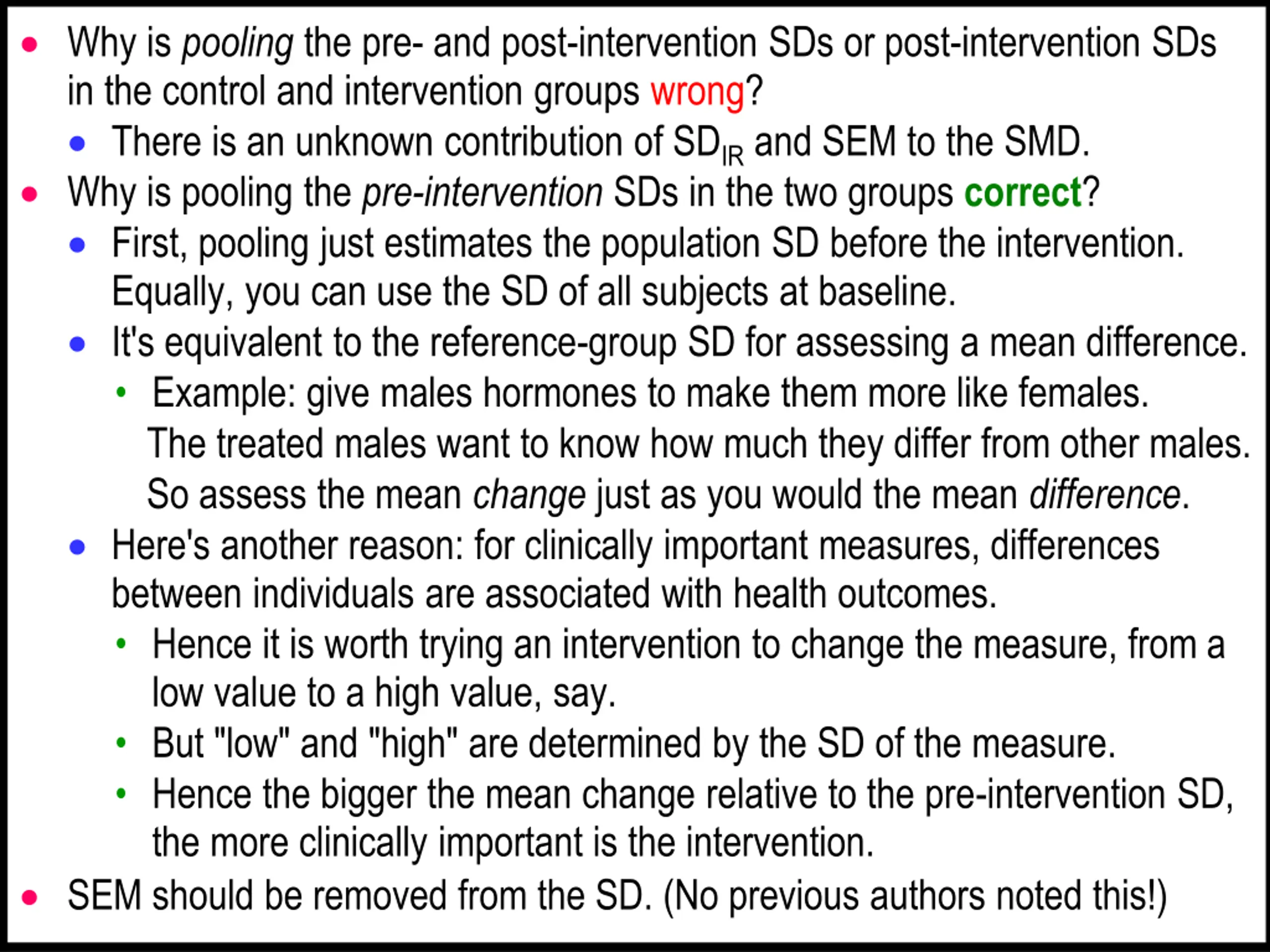Why is pooling the pre- and post-intervention SDs or post-intervention SDs in the control and intervention groups wrong? There is an unknown contribution of SDIR and SEM to the SMD. Why is pooling the pre-intervention SDs in the two groups correct? First, pooling just estimates the population SD before the intervention. Equally, you can use the SD of all subjects at baseline. It's equivalent to the reference-group SD for assessing a mean difference. Example: give males hormones to make them more like females. The treated males want to know how much they differ from other males. So assess the mean change just as you would the mean difference. Here's another reason: for clinically important measures, differences between individuals are associated with health outcomes. Hence it is worth trying an intervention to change the measure, from a low value to a high value, say. But "low" and "high" are determined by the SD of the measure. Hence the bigger the mean change relative to the pre-intervention SD, the more clinically important is the intervention. SEM should be removed from the SD. (No previous authors noted this!)