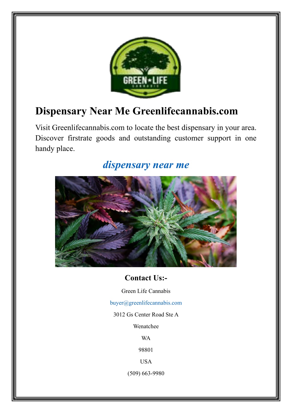 Dispensary Near Me Greenlifecannabis.com Visit Greenlifecannabis.com to locate the best dispensary in your area. Discover firstrate goods and outstanding customer support in one handy place. dispensary near me Contact Us:- Green Life Cannabis buyer@greenlifecannabis.com 3012 Gs Center Road Ste A Wenatchee WA 98801 USA (509) 663-9980