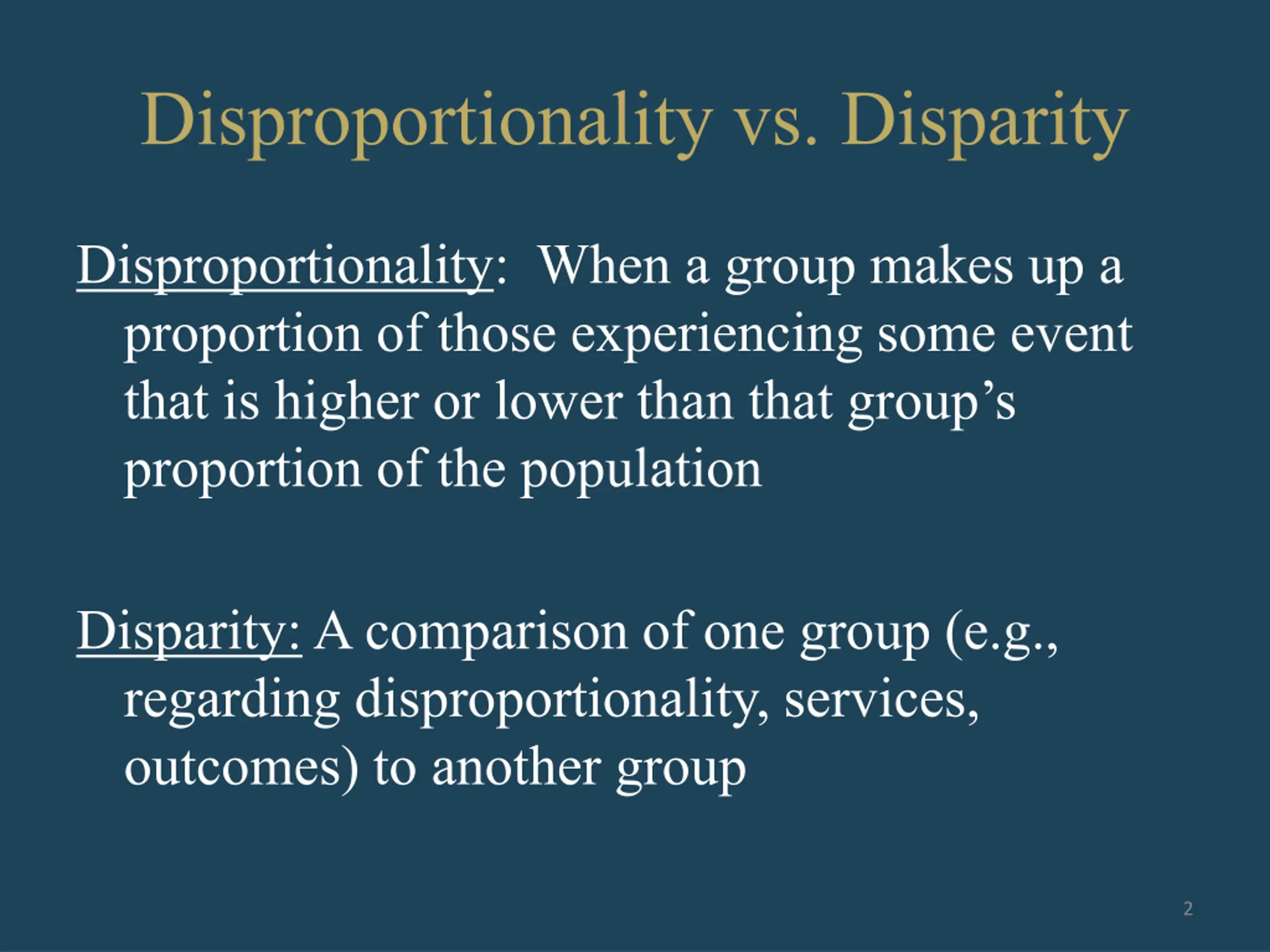 Disproportionality vs. Disparity Disproportionality: When a group makes up a proportion of those experiencing some event that is higher or lower than that group s proportion of the population Disparity: A comparison of one group (e.g., regarding disproportionality, services, outcomes) to another group 2