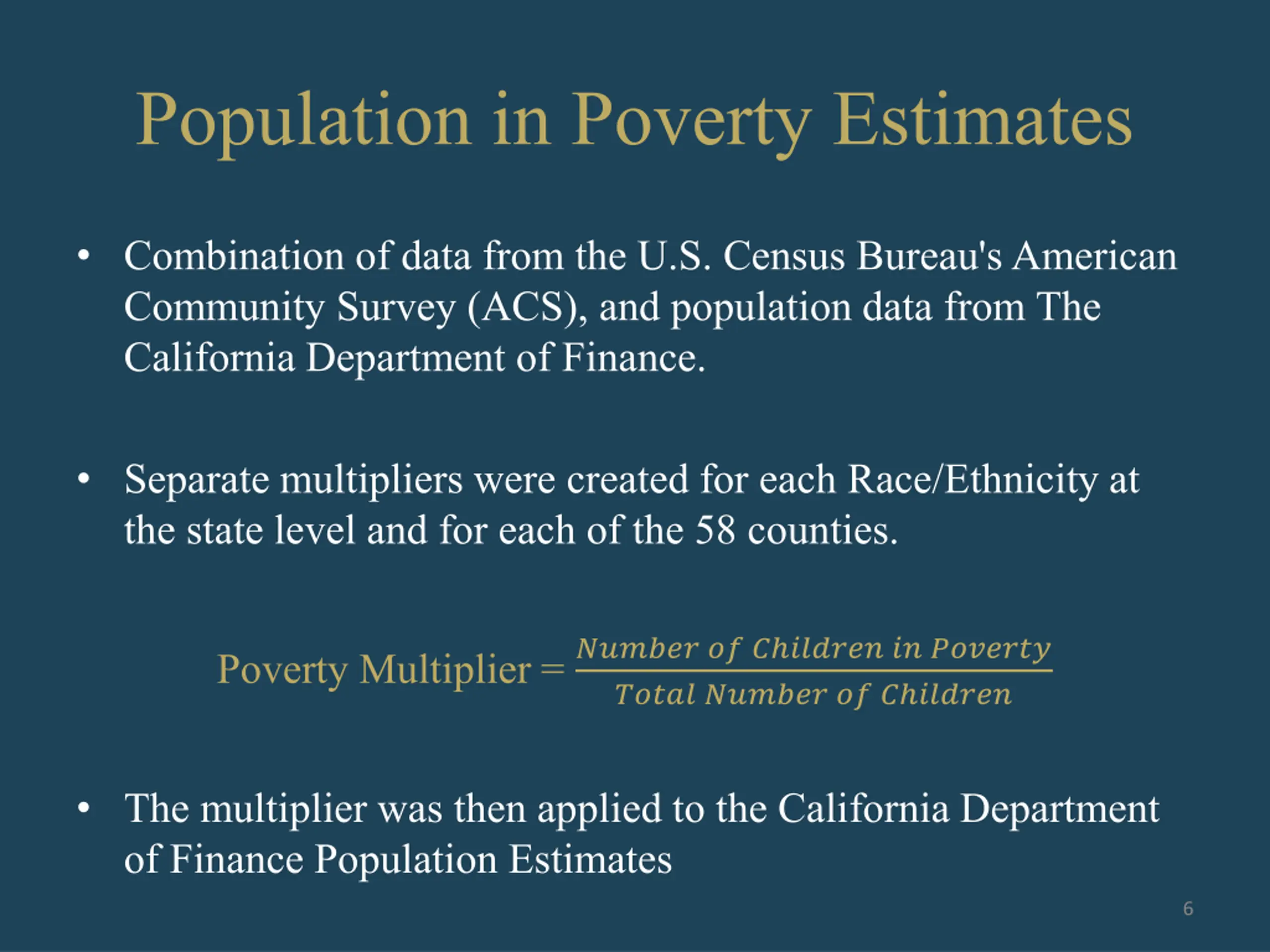 Population in Poverty Estimates Combination of data from the U.S. Census Bureau's American Community Survey (ACS), and population data from The California Department of Finance. Separate multipliers were created for each Race/Ethnicity at the state level and for each of the 58 counties. Poverty Multiplier = ?????? ?? ? ?????? ?? ??????? ????? ?????? ?? ? ?????? The multiplier was then applied to the California Department of Finance Population Estimates 6