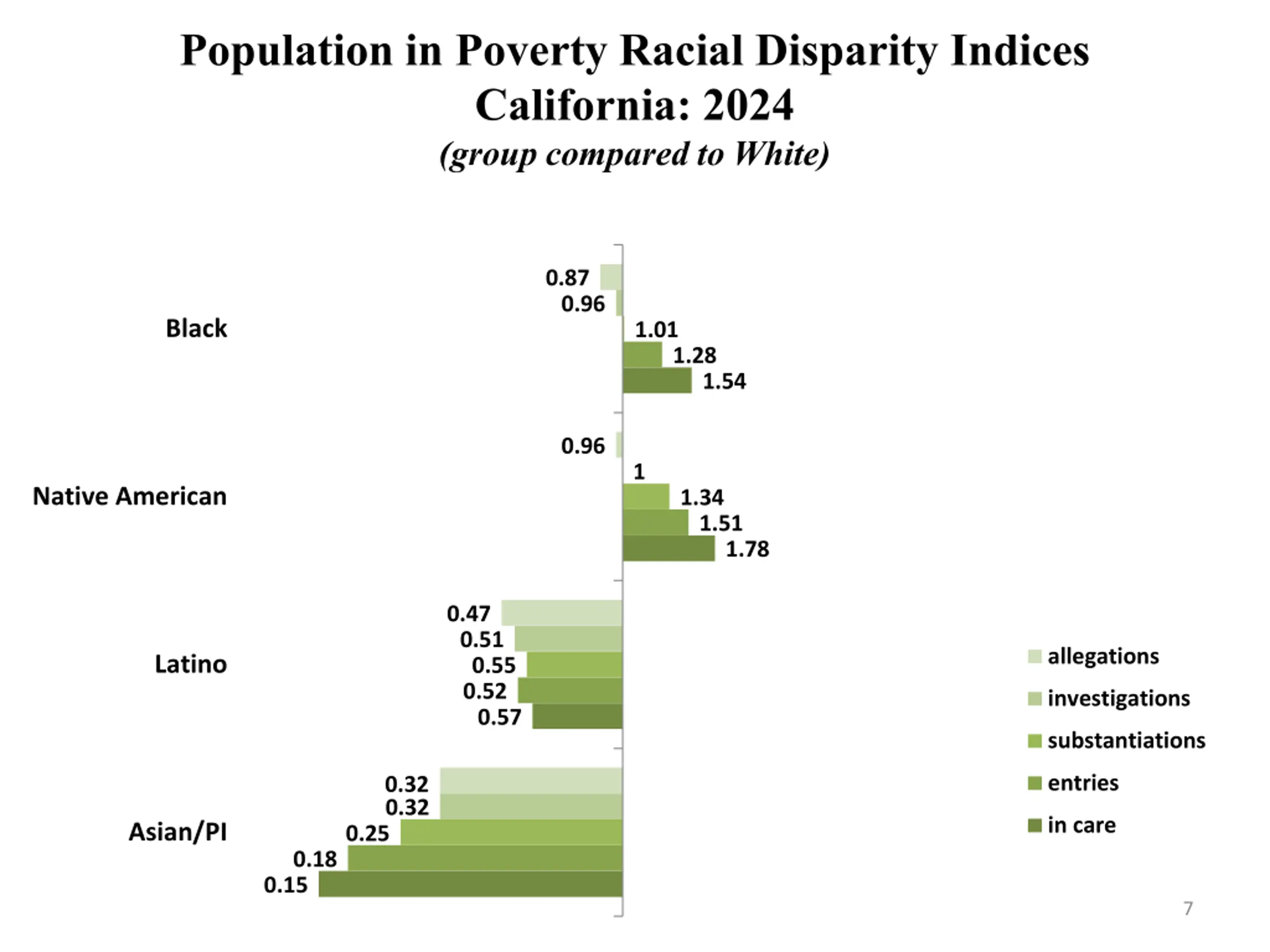 Population in Poverty Racial Disparity Indices California: 2024 (group compared to White) 0.87 0.96 Black 1.01 1.28 1.54 0.96 1 Native American 1.34 1.51 1.78 0.47 0.51 allegations Latino 0.55 0.52 investigations 0.57 substantiations entries 0.32 0.32 in care Asian/PI 0.25 0.18 0.15 7