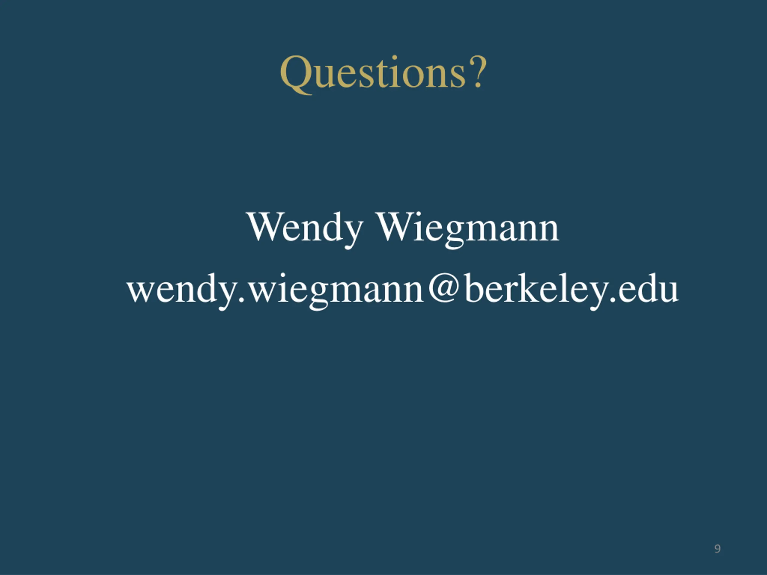 Questions? Wendy Wiegmann wendy.wiegmann@berkeley.edu 9