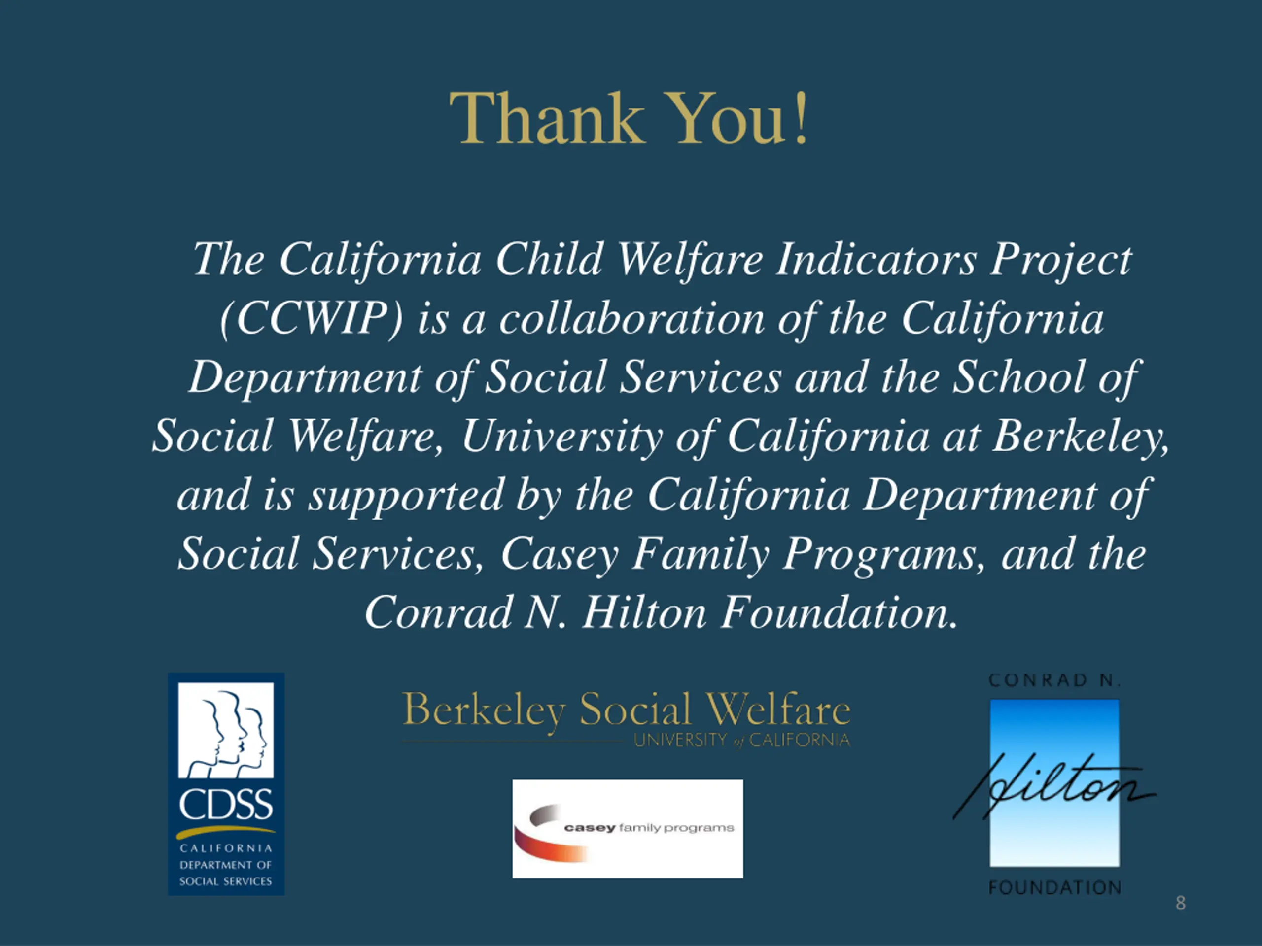 Thank You! The California Child Welfare Indicators Project (CCWIP) is a collaboration of the California Department of Social Services and the School of Social Welfare, University of California at Berkeley, and is supported by the California Department of Social Services, Casey Family Programs, and the Conrad N. Hilton Foundation. 8