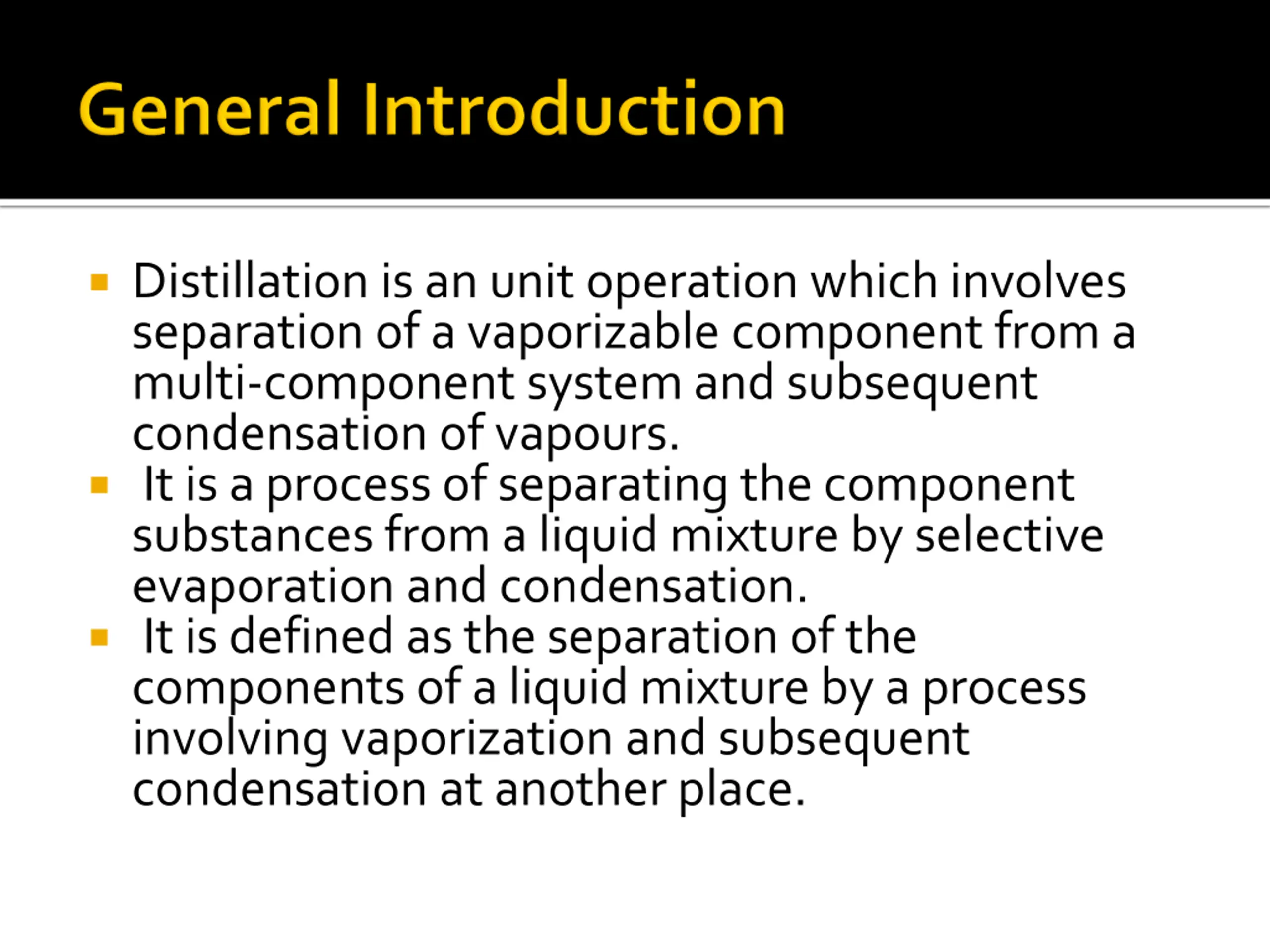 Distillation is an unit operation which involves separation of a vaporizable component from a multi-component system and subsequent condensation of vapours. It is a process of separating the component substances from a liquid mixture by selective evaporation and condensation. It is defined as the separation of the components of a liquid mixture by a process involving vaporization and subsequent condensation at another place.