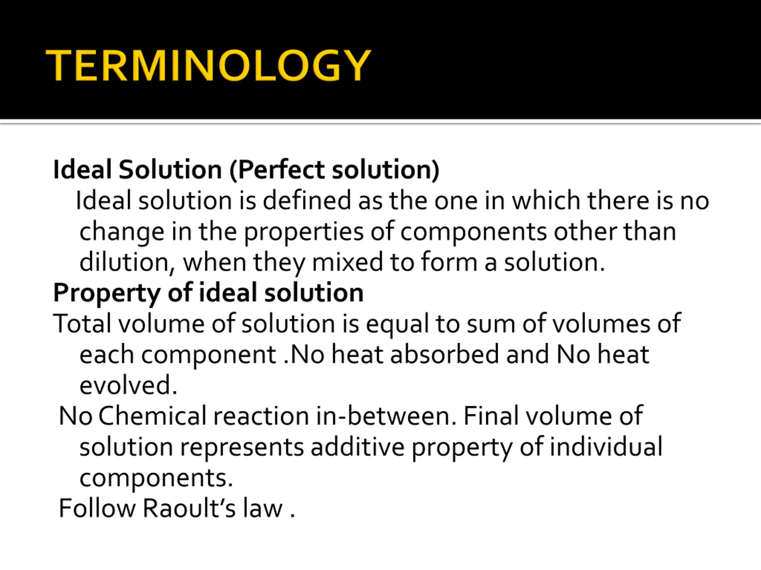 Ideal Solution (Perfect solution) Ideal solution is defined as the one in which there is no change in the properties of components other than dilution, when they mixed to form a solution. Property of ideal solution Total volume of solution is equal to sum of volumes of each component .No heat absorbed and No heat evolved. No Chemical reaction in-between. Final volume of solution represents additive property of individual components. Follow Raoult s law .