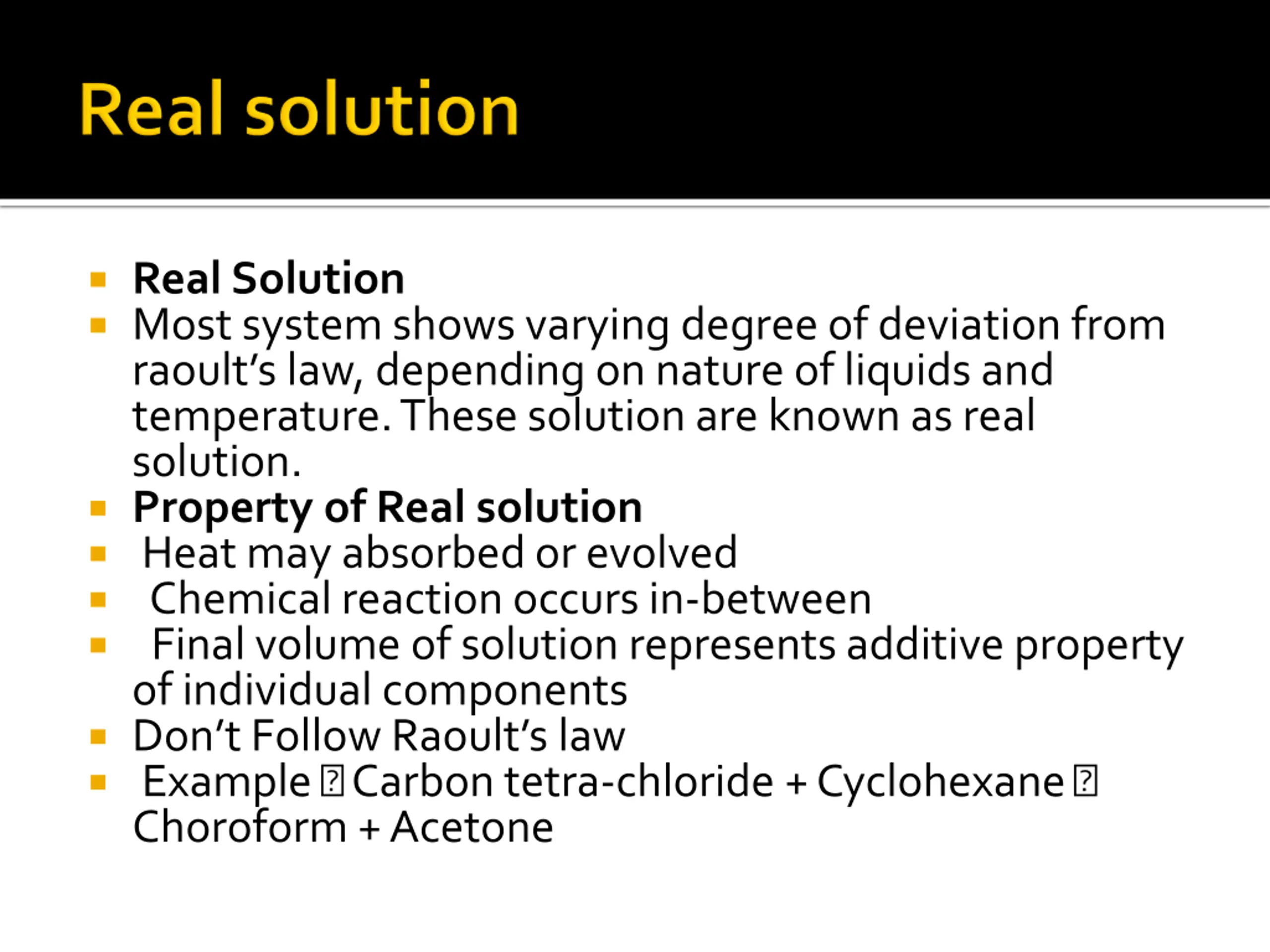 Real Solution Most system shows varying degree of deviation from raoult s law, depending on nature of liquids and temperature. These solution are known as real solution. Property of Real solution Heat may absorbed or evolved Chemical reaction occurs in-between Final volume of solution represents additive property of individual components Don t Follow Raoult s law Example Carbon tetra-chloride + Cyclohexane Choroform+ Acetone