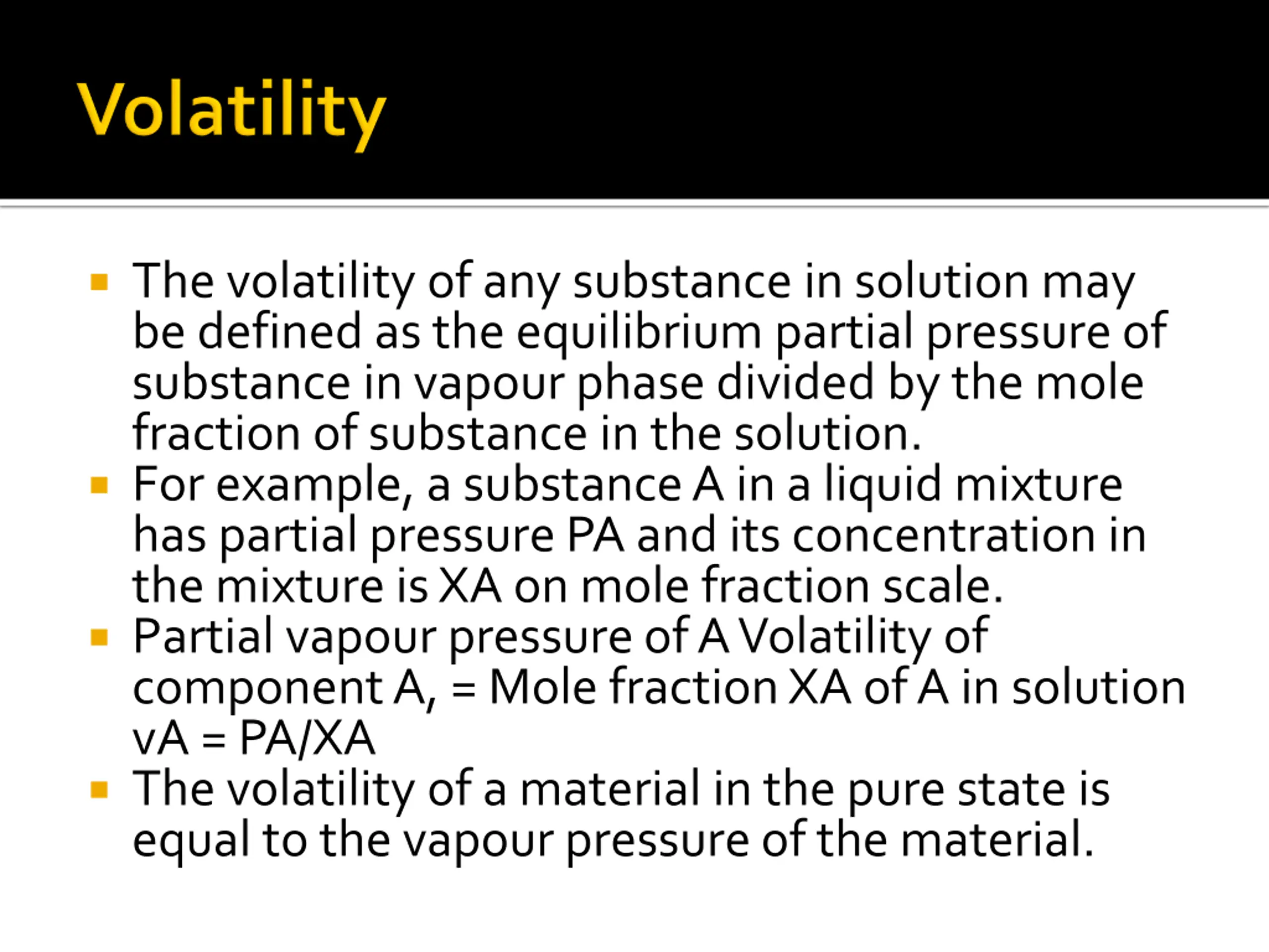 The volatility of any substance in solution may be defined as the equilibrium partial pressure of substance in vapour phase divided by the mole fraction of substance in the solution. For example, a substance A in a liquid mixture has partial pressure PA and its concentration in the mixture is XA on mole fraction scale. Partial vapour pressure of A Volatility of component A, = Mole fraction XA of A in solution vA = PA/XA The volatility of a material in the pure state is equal to the vapour pressure of the material.