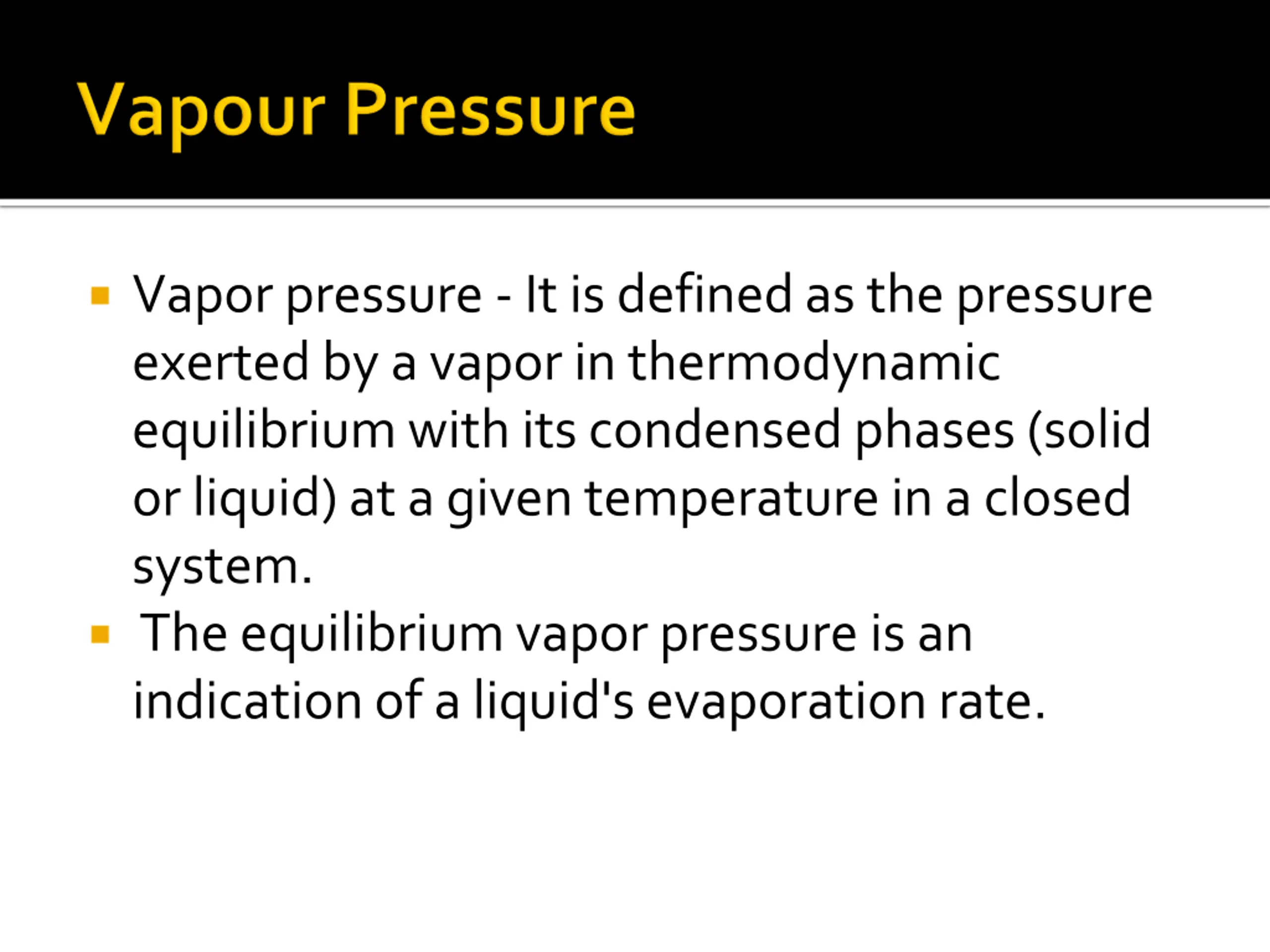 Vapor pressure -It is defined as the pressure exerted by a vapor in thermodynamic equilibrium with its condensed phases (solid or liquid) at a given temperature in a closed system. The equilibrium vapor pressure is an indication of a liquid's evaporation rate.