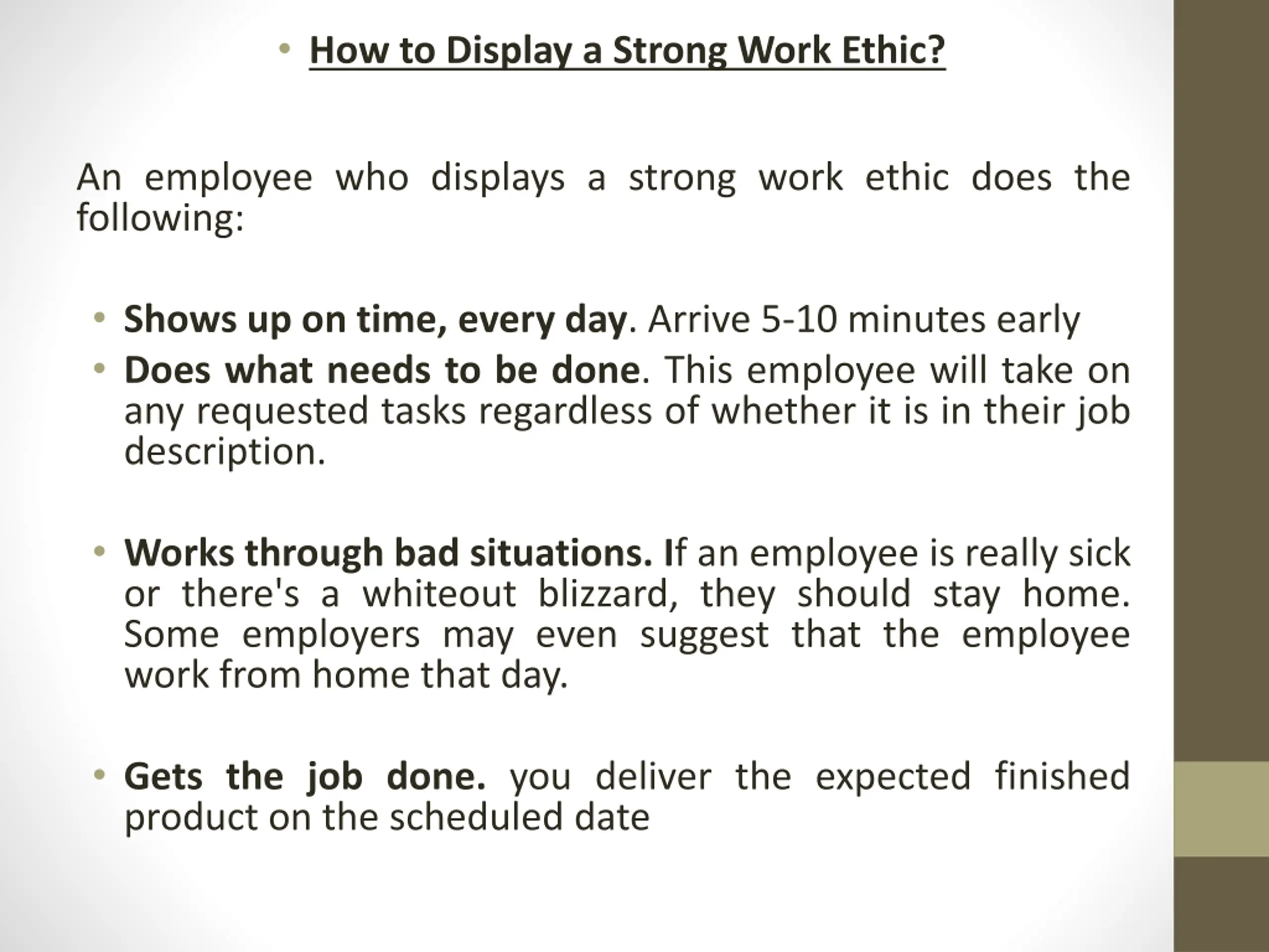 How to Display a Strong Work Ethic? An employee who displays a strong work ethic does the following: Shows up on time, every day. Arrive 5-10 minutes early Does what needs to be done. This employee will take on any requested tasks regardless of whether it is in their job description. Works through bad situations. If an employee is really sick or there's a whiteout blizzard, they should stay home. Some employers may even suggest that the employee work from home that day. Gets the job done. you deliver the expected finished product on the scheduled date