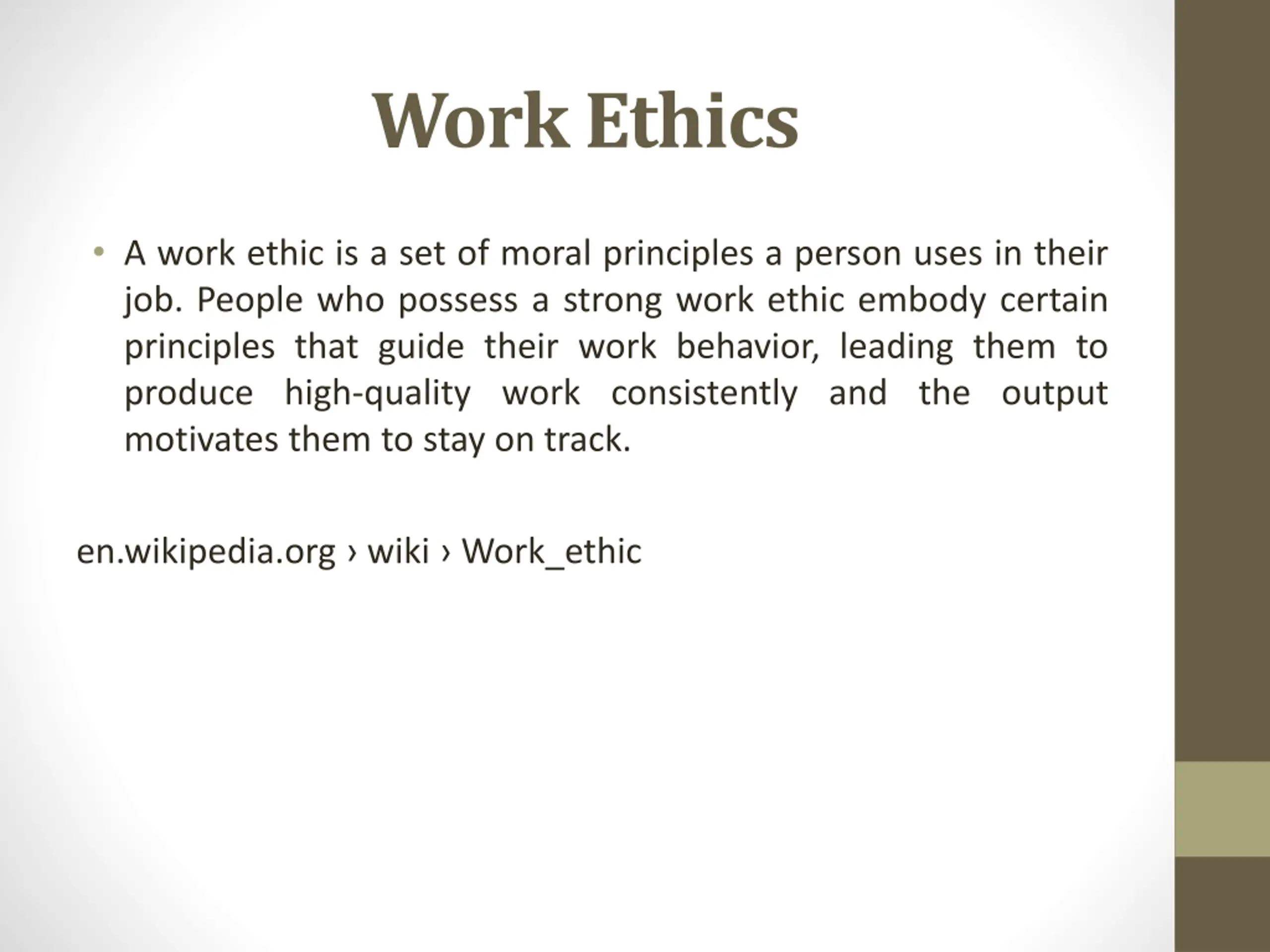 Work Ethics A work ethic is a set of moral principles a person uses in their job. People who possess a strong work ethic embody certain principles that guide their work behavior, leading them to produce high-quality work consistently and the output motivates them to stay on track. en.wikipedia.org wiki Work_ethic