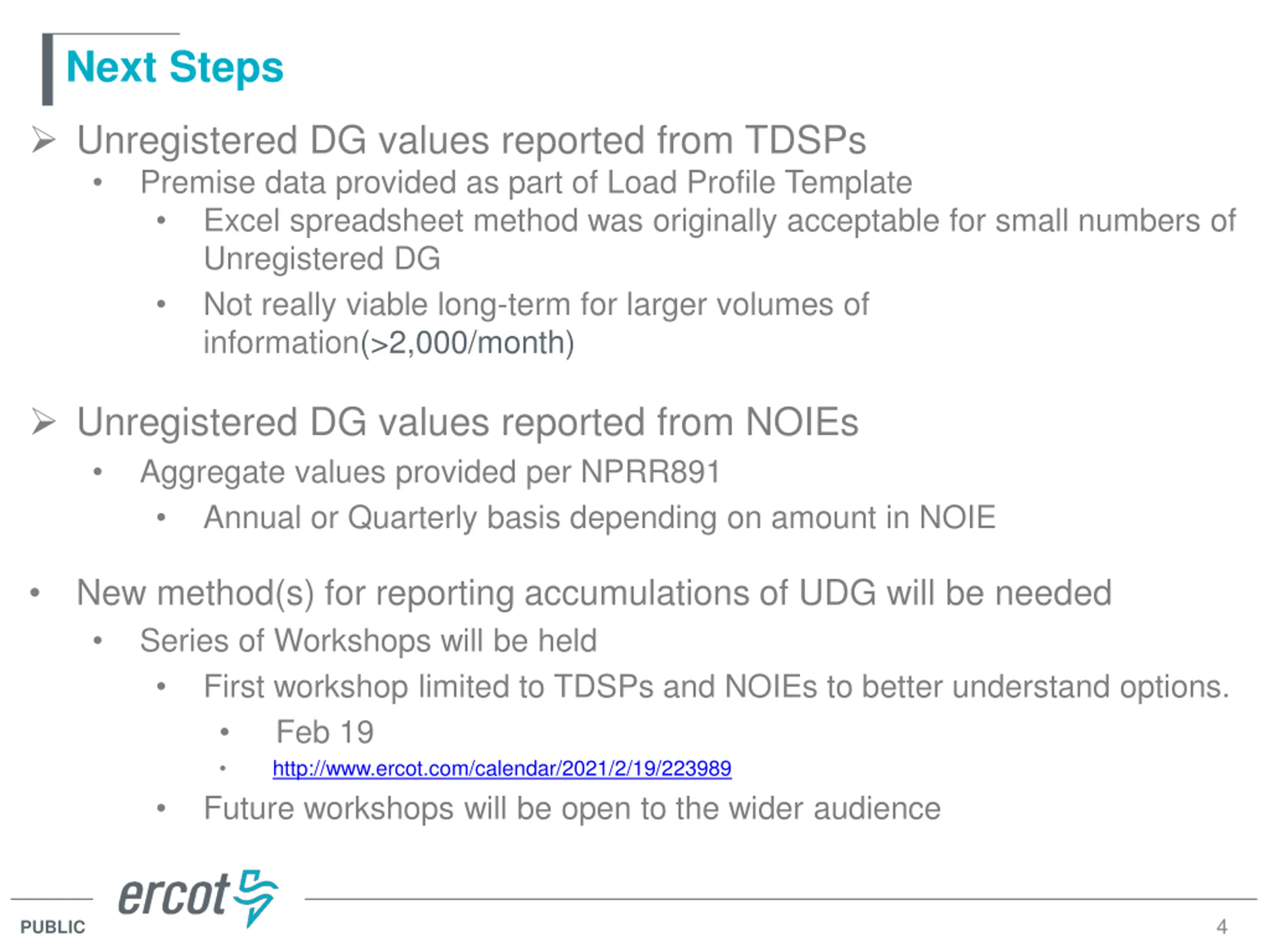 Discussion on Unregistered DG ERCOT has presented at various modeling group meetings on how to capture Unregistered DG Aug 2020-Jan 2021 SSWG mtgs Presentations typically not posted Sept/Oct 2020 PLWG mtgs http://www.ercot.com/content/wcm/key_documents_lists/191727/DER_Proposal_Update_October2020_RPG_PLWG.PDF Nov 2020 PWG http://www.ercot.com/content/wcm/key_documents_lists/195117/PWG_Load_Profile_Proposal_11062020_V1.pptx 2017 DER Reliability Whitepaper outlined the future requirement for Including accumulations of unregistered DG in the ERCOT network model http://www.ercot.com/content/wcm/lists/121384/DERs_Reliability_Impacts_FINAL.pdf 3 PUBLIC