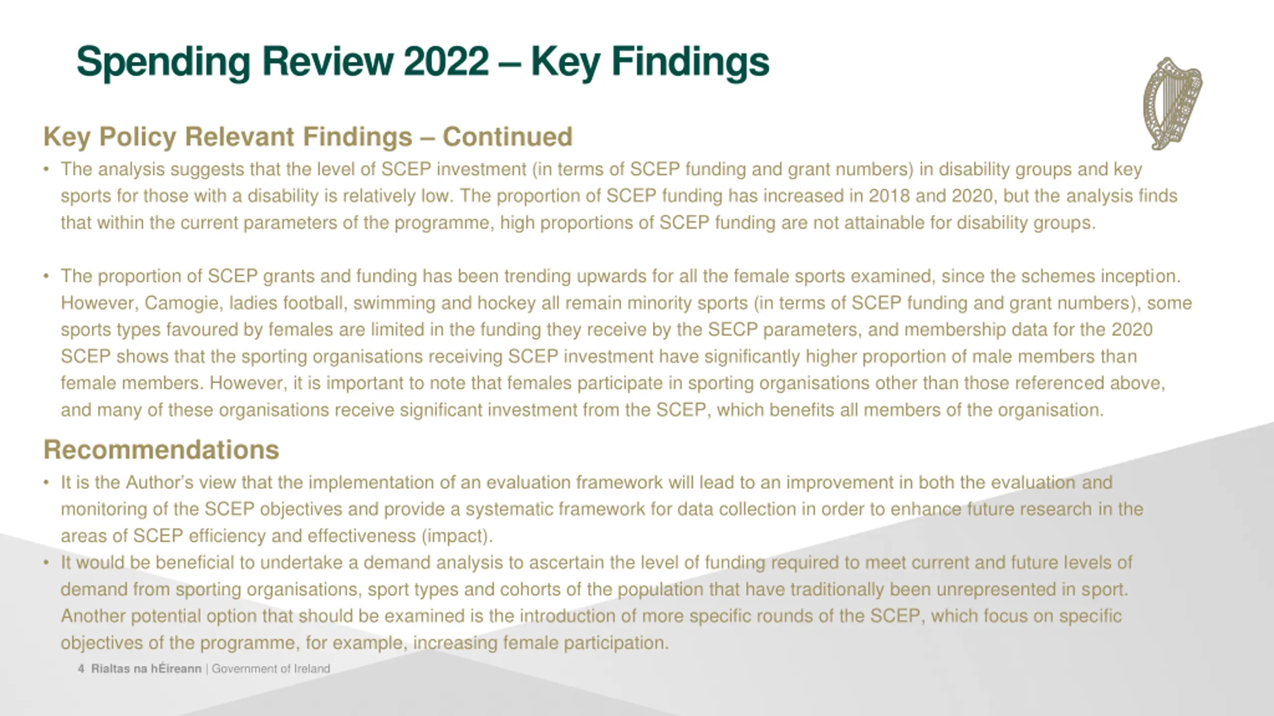 Spending Review 2022 Key Findings Key Policy Relevant Findings Continued The analysis suggests that the level of SCEP investment (in terms of SCEP funding and grant numbers) in disability groups and key sports for those with a disability is relatively low. The proportion of SCEP funding has increased in 2018 and 2020, but the analysis finds that within the current parameters of the programme, high proportions of SCEP funding are not attainable for disability groups. The proportion of SCEP grants and funding has been trending upwards for all the female sports examined, since the schemes inception. However, Camogie, ladies football, swimming and hockey all remain minority sports (in terms of SCEP funding and grant numbers), some sports types favoured by females are limited in the funding they receive by the SECP parameters, and membership data for the 2020 SCEP shows that the sporting organisations receiving SCEP investment have significantly higher proportion of male members than female members. However, it is important to note that females participate in sporting organisations other than those referenced above, and many of these organisations receive significant investment from the SCEP, which benefits all members of the organisation. Recommendations It is the Author s view that the implementation of an evaluation framework will lead to an improvement in both the evaluation and monitoring of the SCEP objectives and provide a systematic framework for data collection in order to enhance future research in the areas of SCEP efficiency and effectiveness (impact). It would be beneficial to undertake a demand analysis to ascertain the level of funding required to meet current and future levels of demand from sporting organisations, sport types and cohorts of the population that have traditionally been unrepresented in sport. Another potential option that should be examined is the introduction of more specific rounds of the SCEP, which focus on specific objectives of the programme, for example, increasing female participation. 4 Rialtas na h ireann | Government of Ireland