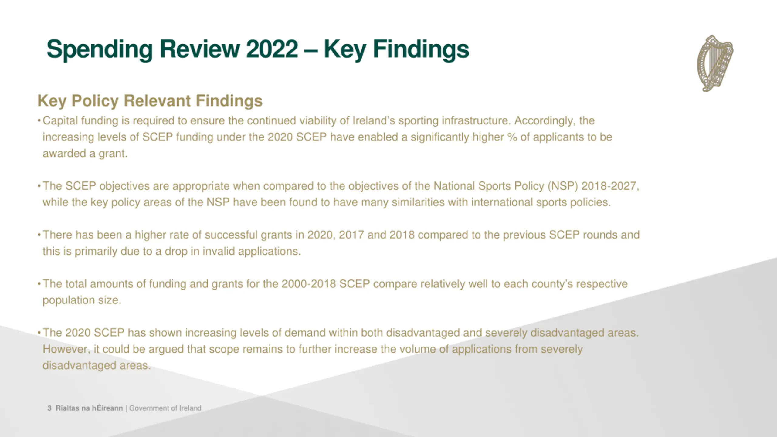 Spending Review 2022 Key Findings Key Policy Relevant Findings Capital funding is required to ensure the continued viability of Ireland s sporting infrastructure. Accordingly, the increasing levels of SCEP funding under the 2020 SCEP have enabled a significantly higher % of applicants to be awarded a grant. The SCEP objectives are appropriate when compared to the objectives of the National Sports Policy (NSP) 2018-2027, while the key policy areas of the NSP have been found to have many similarities with international sports policies. There has been a higher rate of successful grants in 2020, 2017 and 2018 compared to the previous SCEP rounds and this is primarily due to a drop in invalid applications. The total amounts of funding and grants for the 2000-2018 SCEP compare relatively well to each county s respective population size. The 2020 SCEP has shown increasing levels of demand within both disadvantaged and severely disadvantaged areas. However, it could be argued that scope remains to further increase the volume of applications from severely disadvantaged areas. 3 Rialtas na h ireann | Government of Ireland