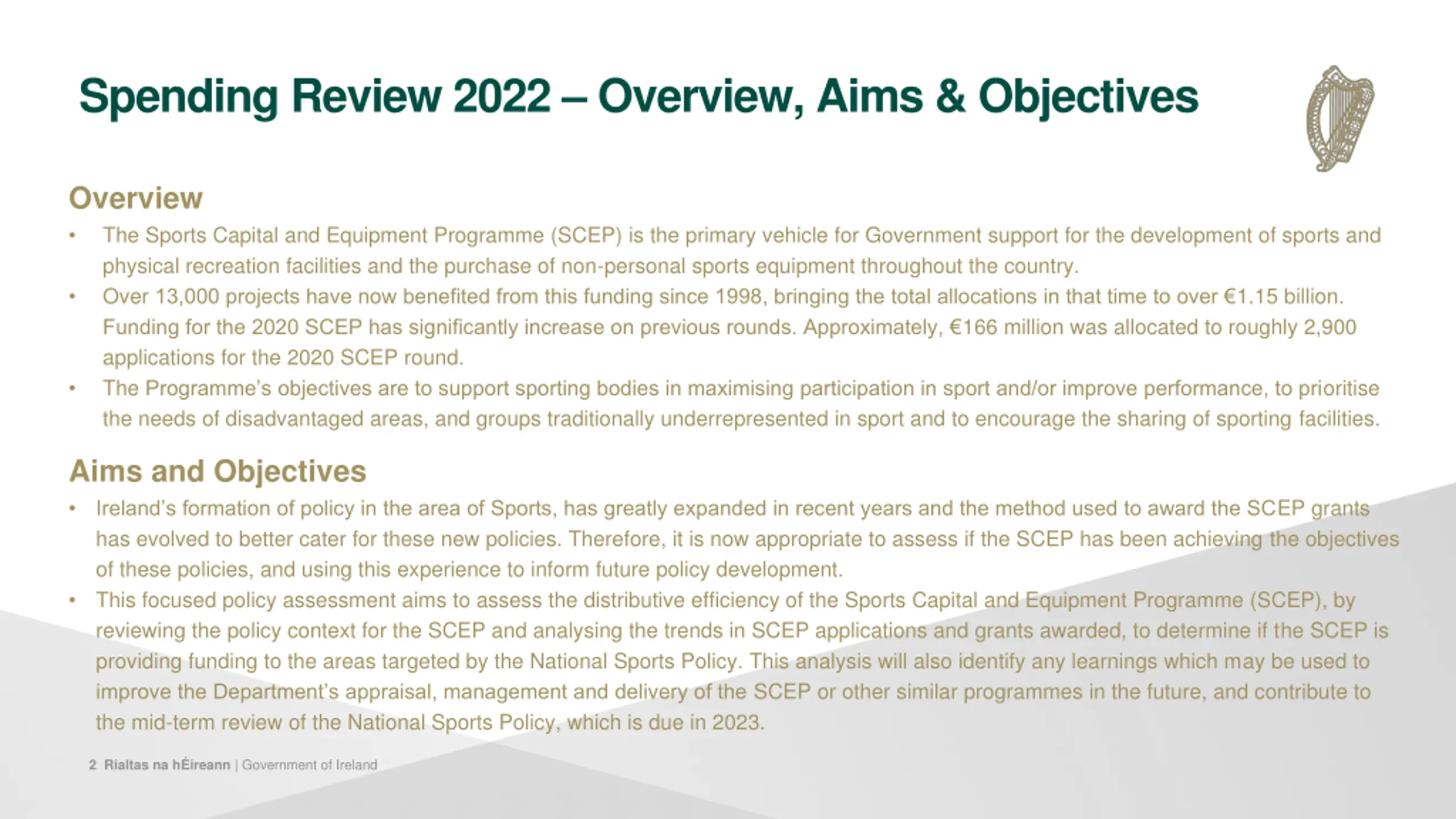 Spending Review 2022 Overview, Aims & Objectives Overview The Sports Capital and Equipment Programme (SCEP) is the primary vehicle for Government support for the development of sports and physical recreation facilities and the purchase of non-personal sports equipment throughout the country. Over 13,000 projects have now benefited from this funding since 1998, bringing the total allocations in that time to over 1.15 billion. Funding for the 2020 SCEP has significantly increase on previous rounds. Approximately, 166 million was allocated to roughly 2,900 applications for the 2020 SCEP round. The Programme s objectives are to support sporting bodies in maximising participation in sport and/or improve performance, to prioritise the needs of disadvantaged areas, and groups traditionally underrepresented in sport and to encourage the sharing of sporting facilities. Aims and Objectives Ireland s formation of policy in the area of Sports, has greatly expanded in recent years and the method used to award the SCEP grants has evolved to better cater for these new policies. Therefore, it is now appropriate to assess if the SCEP has been achieving the objectives of these policies, and using this experience to inform future policy development. This focused policy assessment aims to assess the distributive efficiency of the Sports Capital and Equipment Programme (SCEP), by reviewing the policy context for the SCEP and analysing the trends in SCEP applications and grants awarded, to determine if the SCEP is providing funding to the areas targeted by the National Sports Policy. This analysis will also identify any learnings which may be used to improve the Department s appraisal, management and delivery of the SCEP or other similar programmes in the future, and contribute to the mid-term review of the National Sports Policy, which is due in 2023. 2 Rialtas na h ireann | Government of Ireland