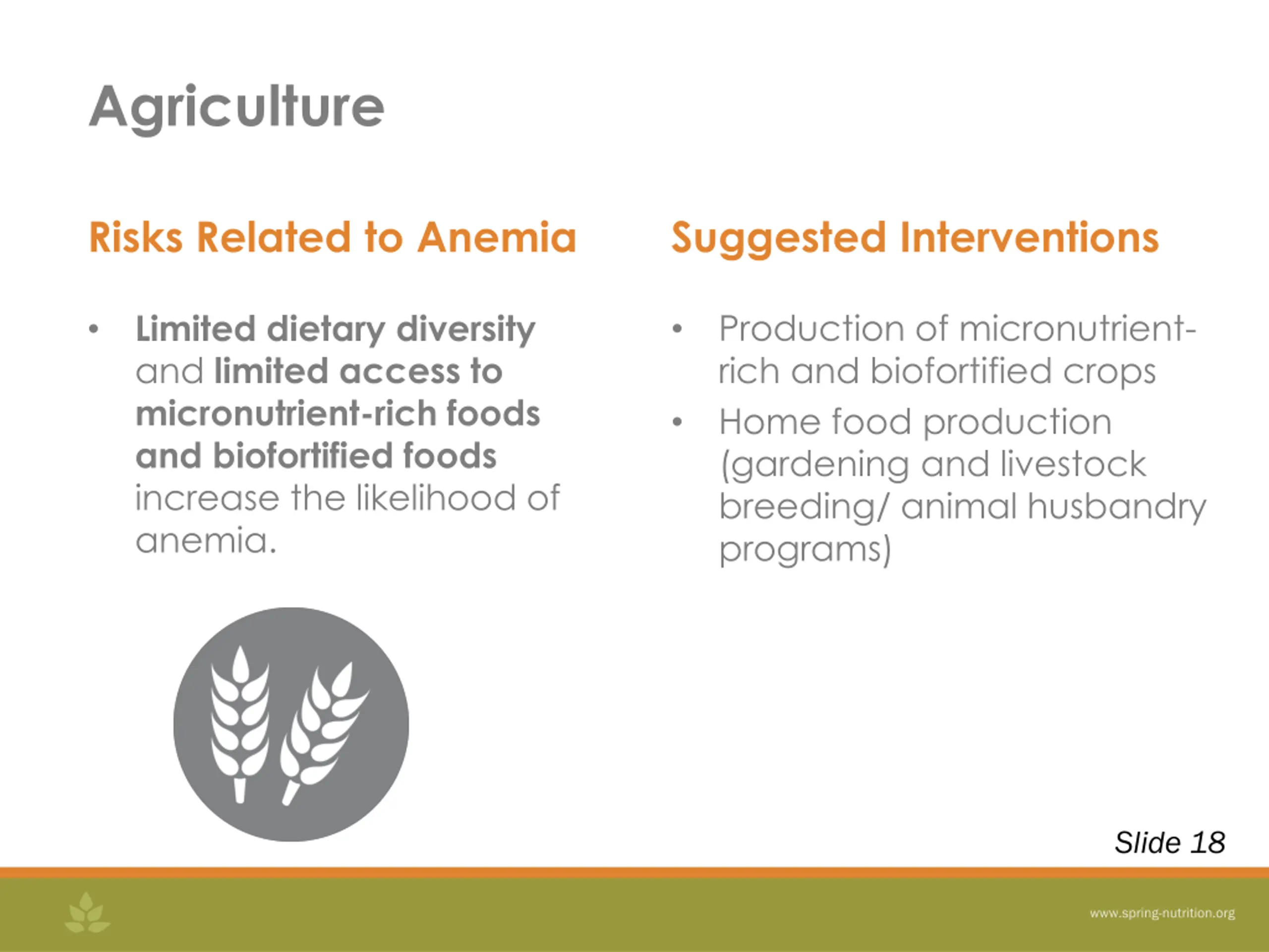 Agriculture Risks Related to Anemia Suggested Interventions Production of micronutrient- rich and biofortified crops Home food production (gardening and livestock breeding/ animal husbandry programs) Limited dietary diversity and limited access to micronutrient-rich foods and biofortified foods increase the likelihood of anemia. Slide 18