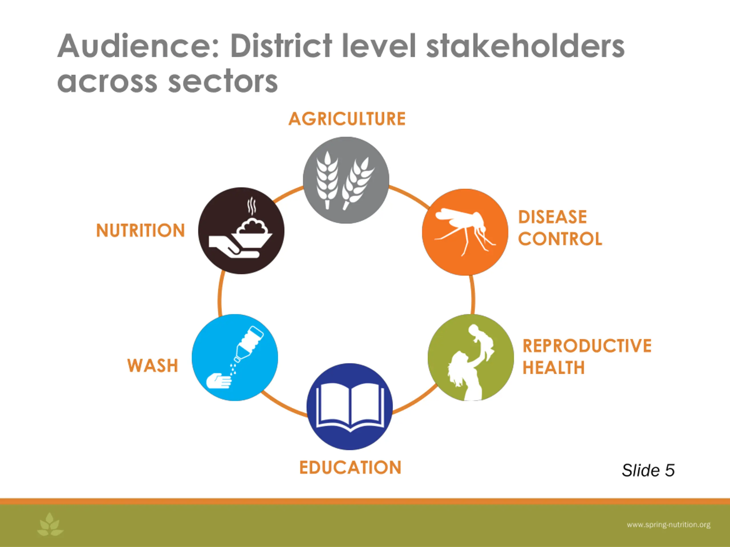 Audience: District level stakeholders across sectors AGRICULTURE DISEASE CONTROL NUTRITION REPRODUCTIVE HEALTH WASH EDUCATION Slide 5