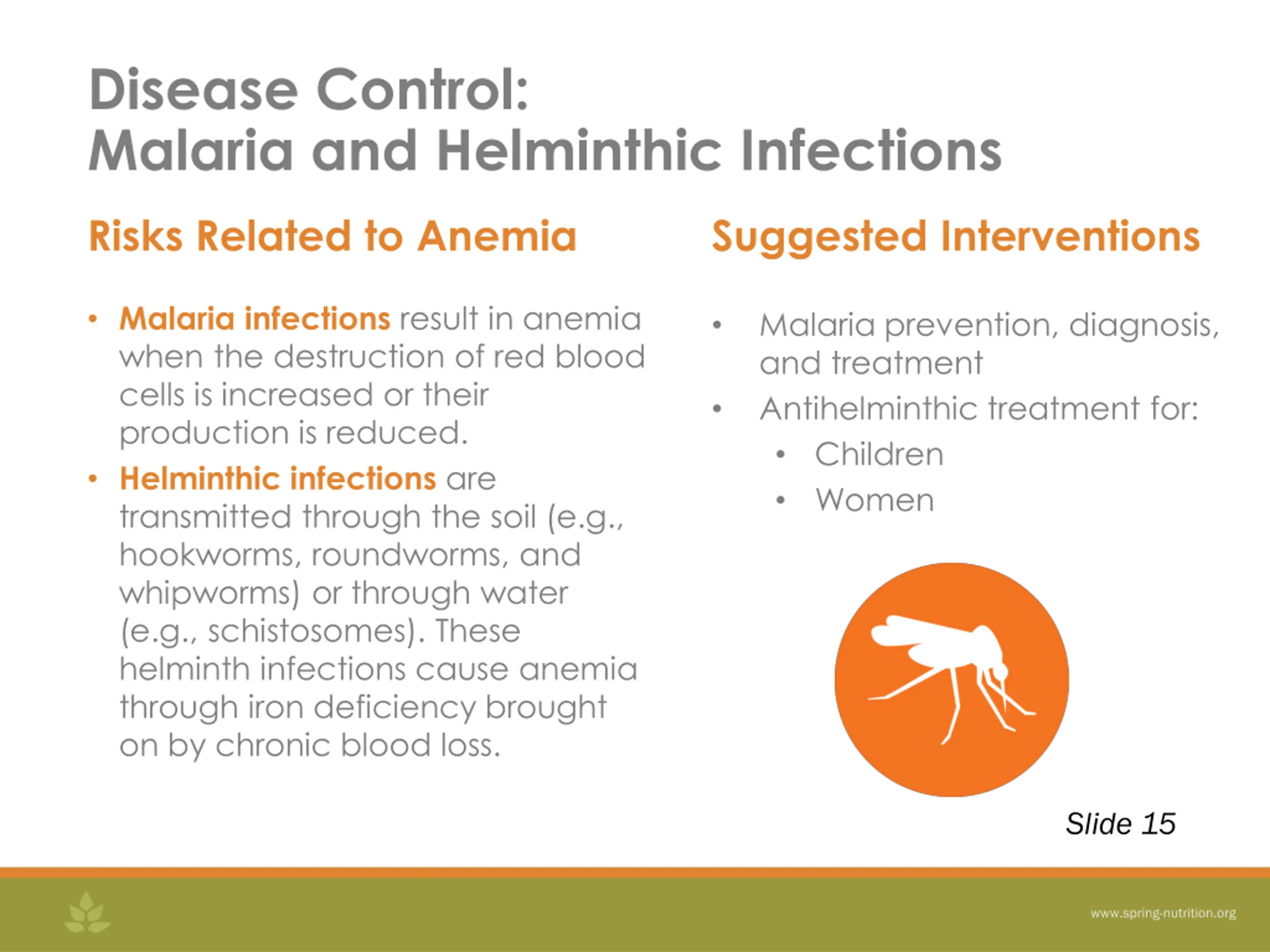 Disease Control: Malaria and Helminthic Infections Risks Related to Anemia Suggested Interventions Malaria infections result in anemia when the destruction of red blood cells is increased or their production is reduced. Helminthic infections are transmitted through the soil (e.g., hookworms, roundworms, and whipworms) or through water (e.g., schistosomes). These helminth infections cause anemia through iron deficiency brought on by chronic blood loss. Malaria prevention, diagnosis, and treatment Antihelminthic treatment for: Children Women Slide 15