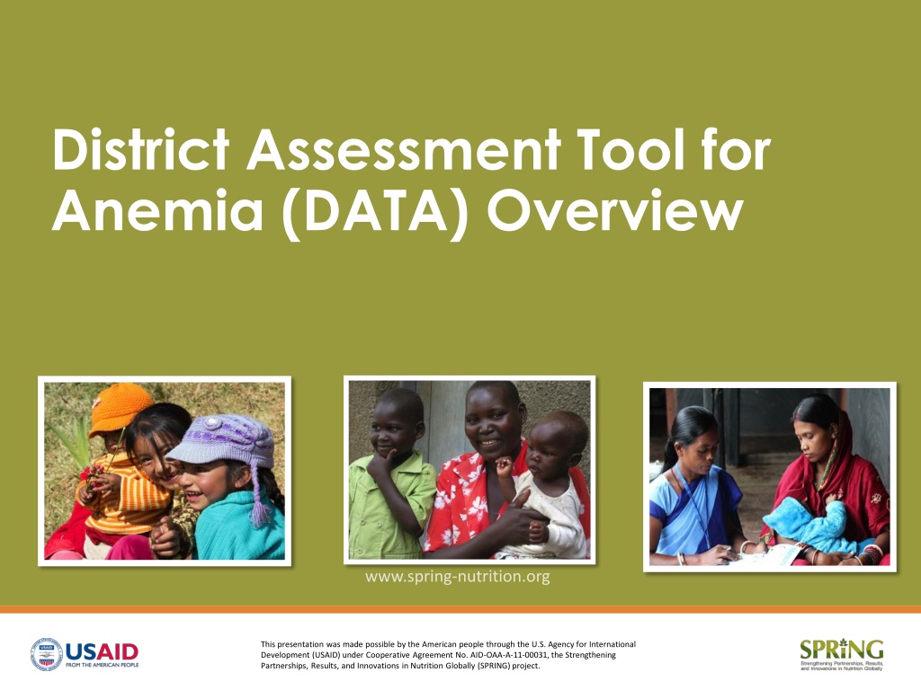 District Assessment Tool for Anemia (DATA) Overview This presentation was made possible by the American people through the U.S. Agency for International Development (USAID) under Cooperative Agreement No. AID-OAA-A-11-00031, the Strengthening Partnerships, Results, and Innovations in Nutrition Globally (SPRING) project.