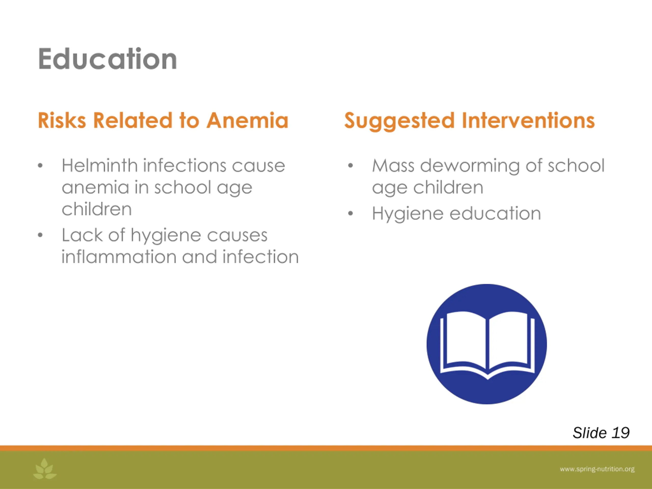 Education Risks Related to Anemia Suggested Interventions Helminth infections cause anemia in school age children Lack of hygiene causes inflammation and infection Mass deworming of school age children Hygiene education Slide 19
