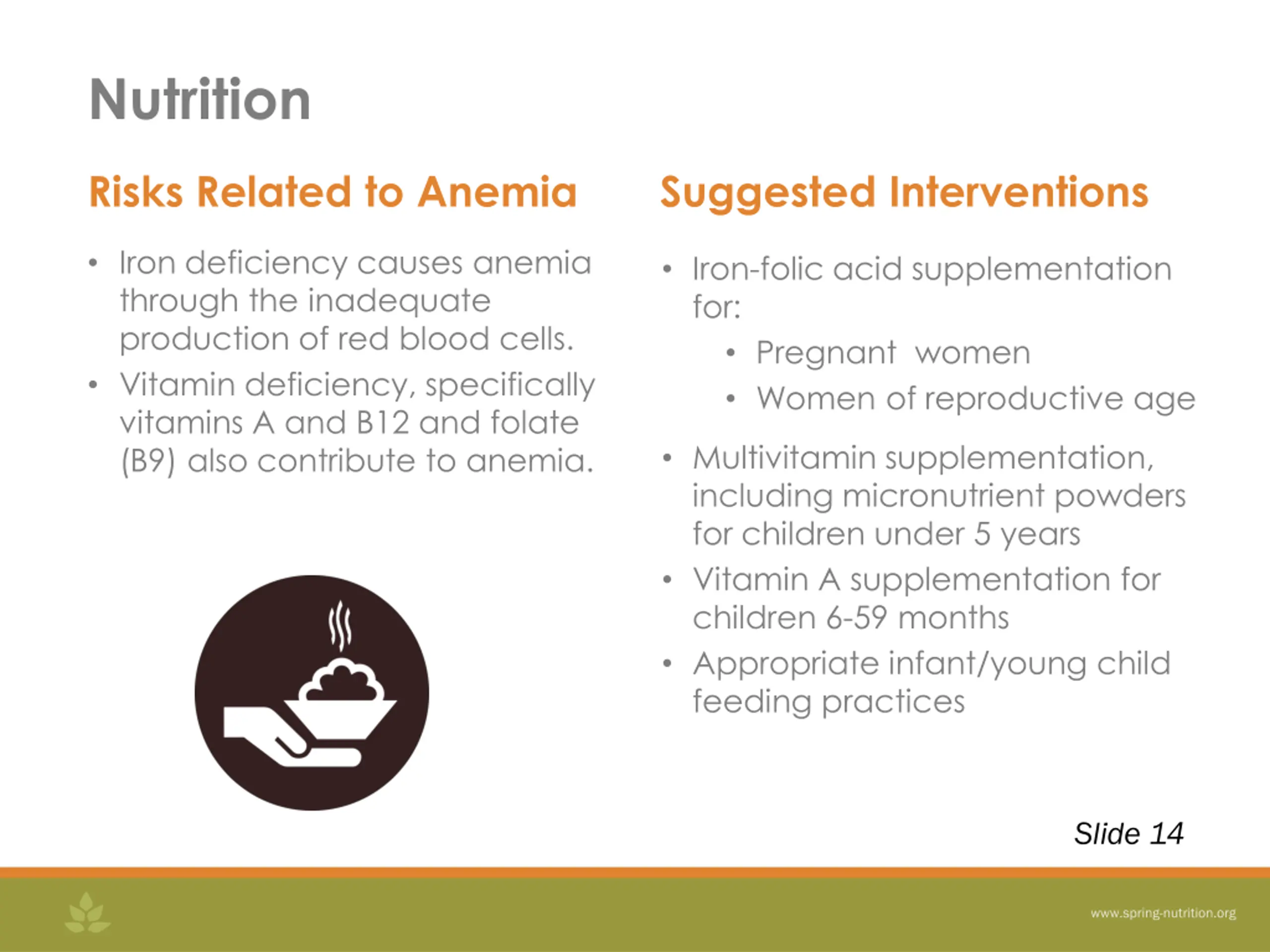 Nutrition Risks Related to Anemia Suggested Interventions Iron deficiency causes anemia through the inadequate production of red blood cells. Vitamin deficiency, specifically vitamins A and B12 and folate (B9) also contribute to anemia. Iron-folic acid supplementation for: Pregnant women Women of reproductive age Multivitamin supplementation, including micronutrient powders for children under 5 years Vitamin A supplementation for children 6-59 months Appropriate infant/young child feeding practices Slide 14