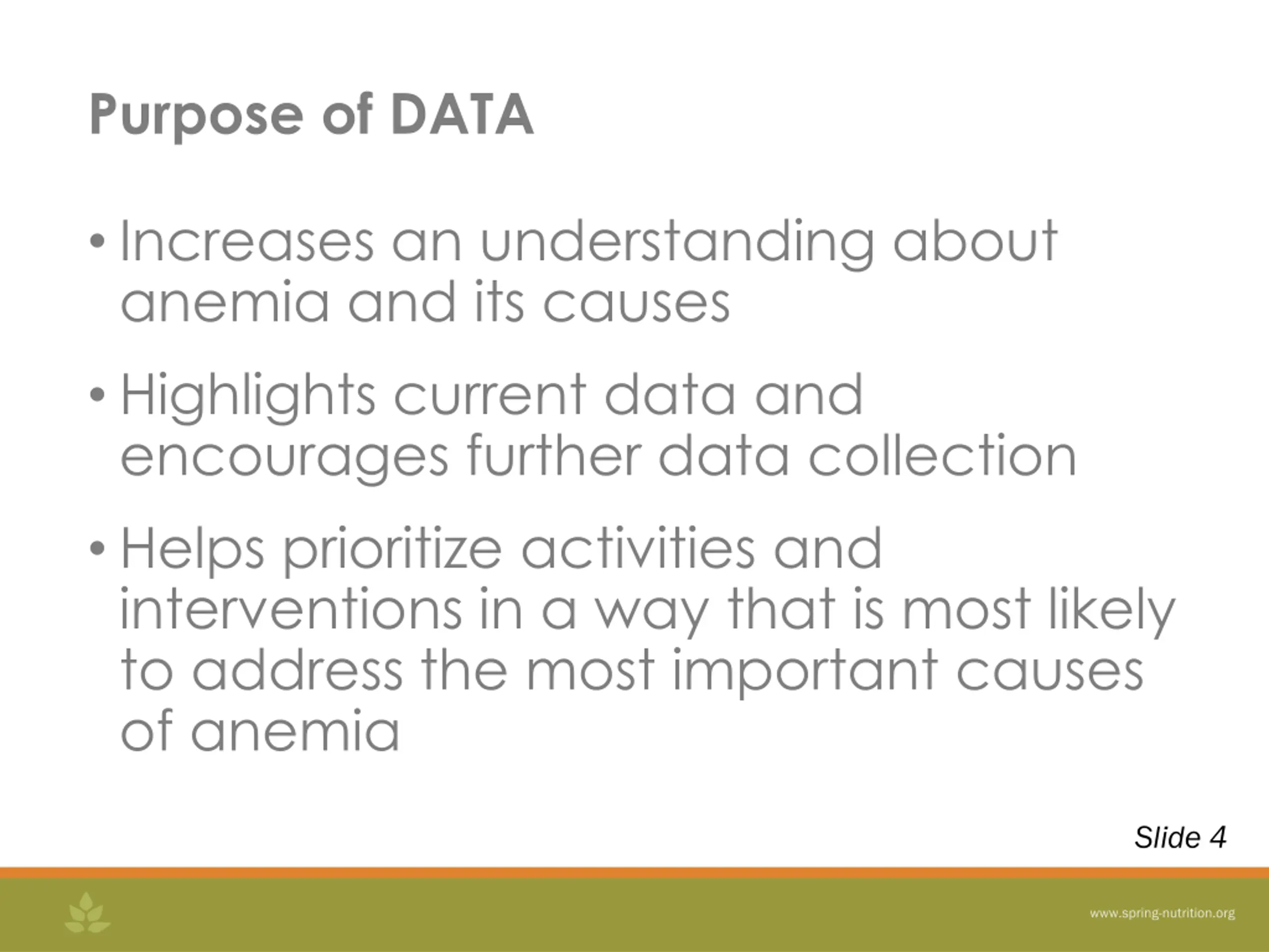 Purpose of DATA Increases an understanding about anemia and its causes Highlights current data and encourages further data collection Helps prioritize activities and interventions in a way that is most likely to address the most important causes of anemia Slide 4