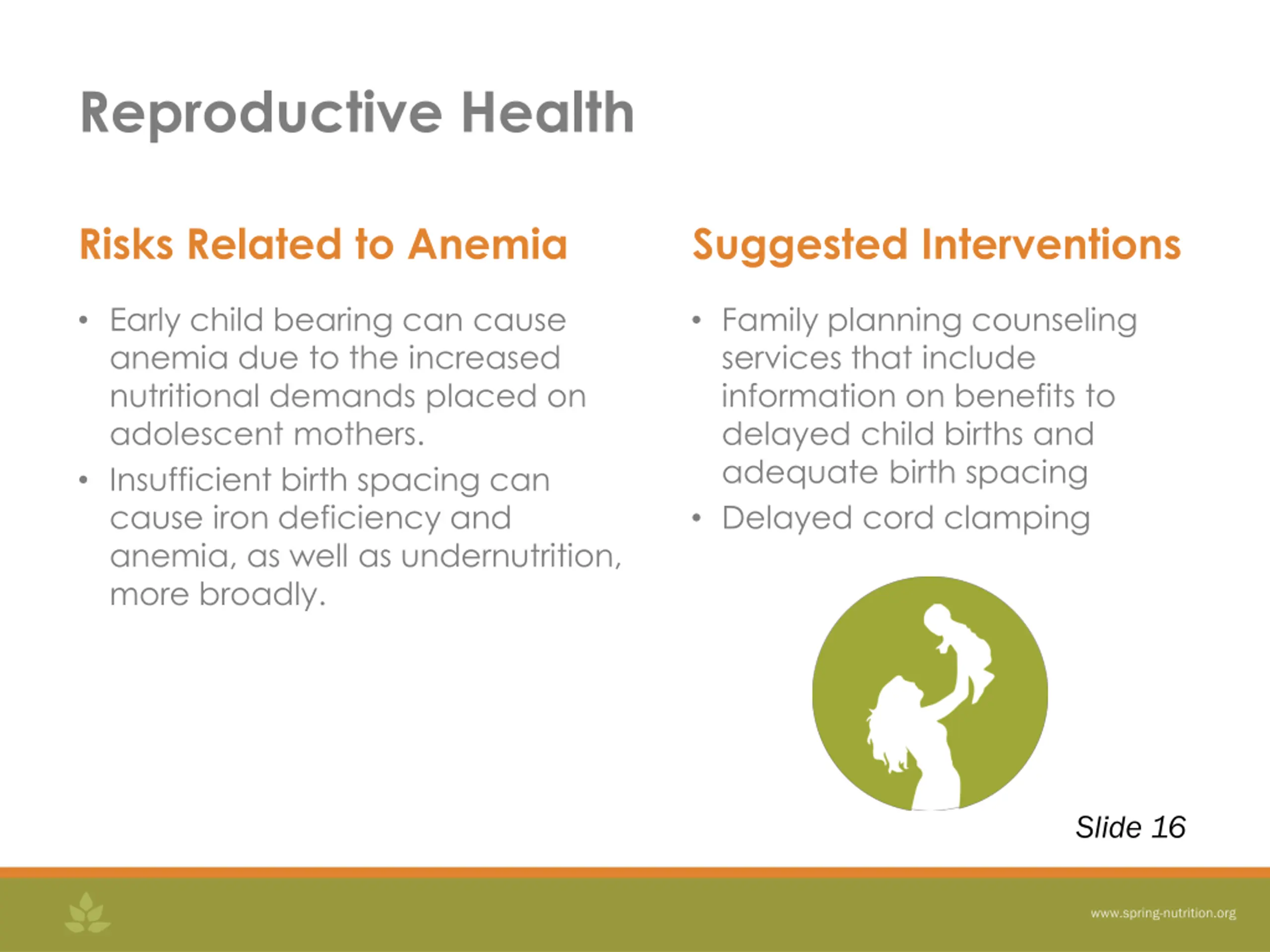 Reproductive Health Risks Related to Anemia Suggested Interventions Early child bearing can cause anemia due to the increased nutritional demands placed on adolescent mothers. Insufficient birth spacing can cause iron deficiency and anemia, as well as undernutrition, more broadly. Family planning counseling services that include information on benefits to delayed child births and adequate birth spacing Delayed cord clamping Slide 16
