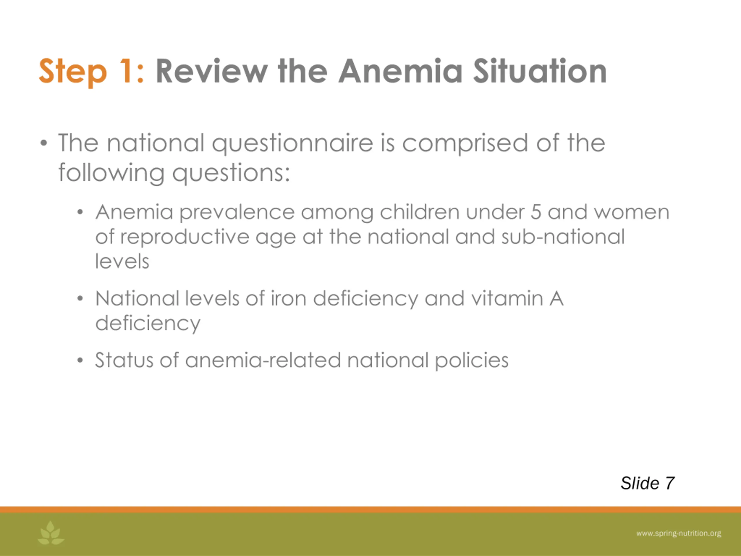 Step 1: Review the Anemia Situation The national questionnaire is comprised of the following questions: Anemia prevalence among children under 5 and women of reproductive age at the national and sub-national levels National levels of iron deficiency and vitamin A deficiency Status of anemia-related national policies Slide 7