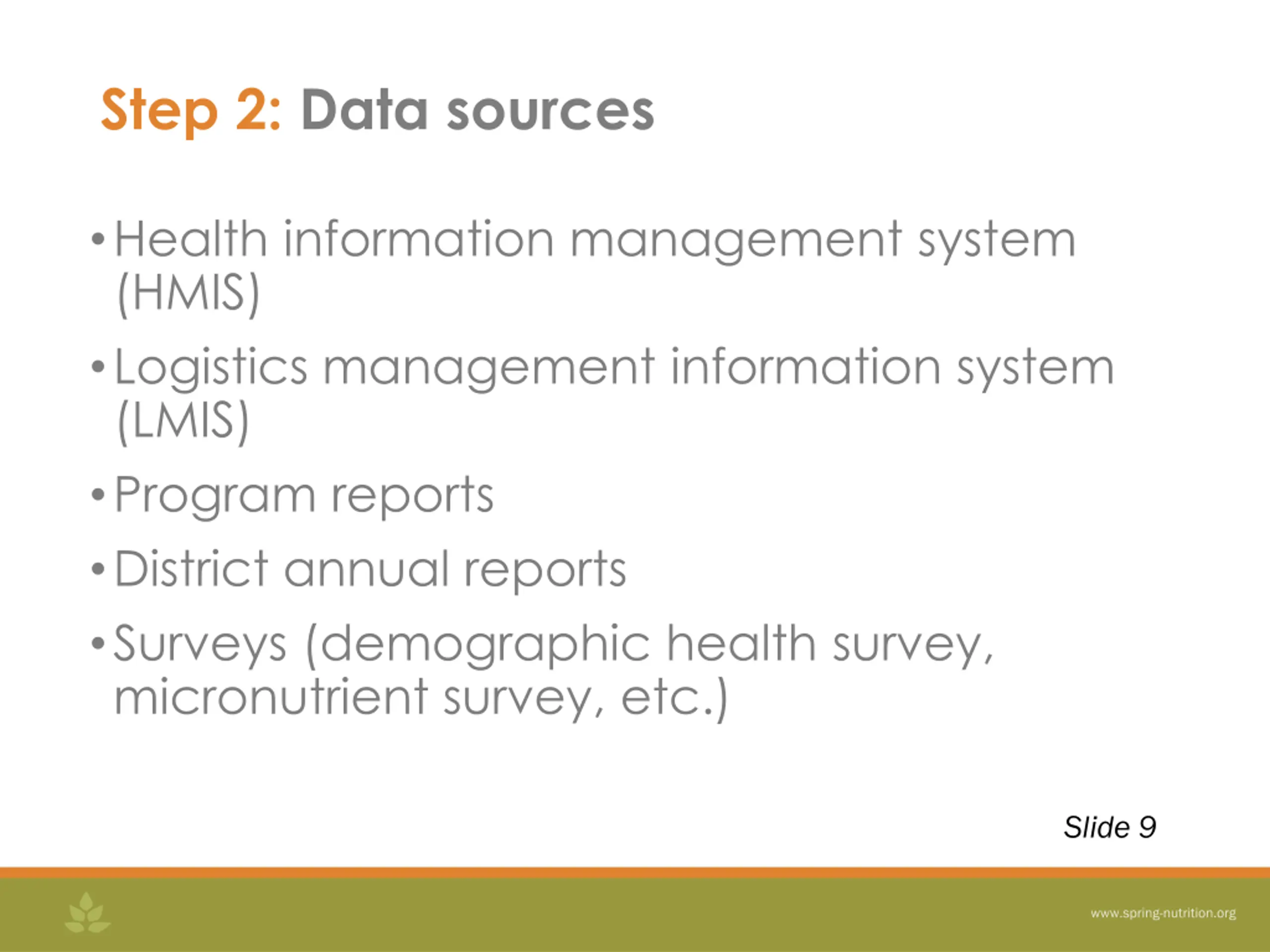 Step 2: Data sources Health information management system (HMIS) Logistics management information system (LMIS) Program reports District annual reports Surveys (demographic health survey, micronutrient survey, etc.) Slide 9