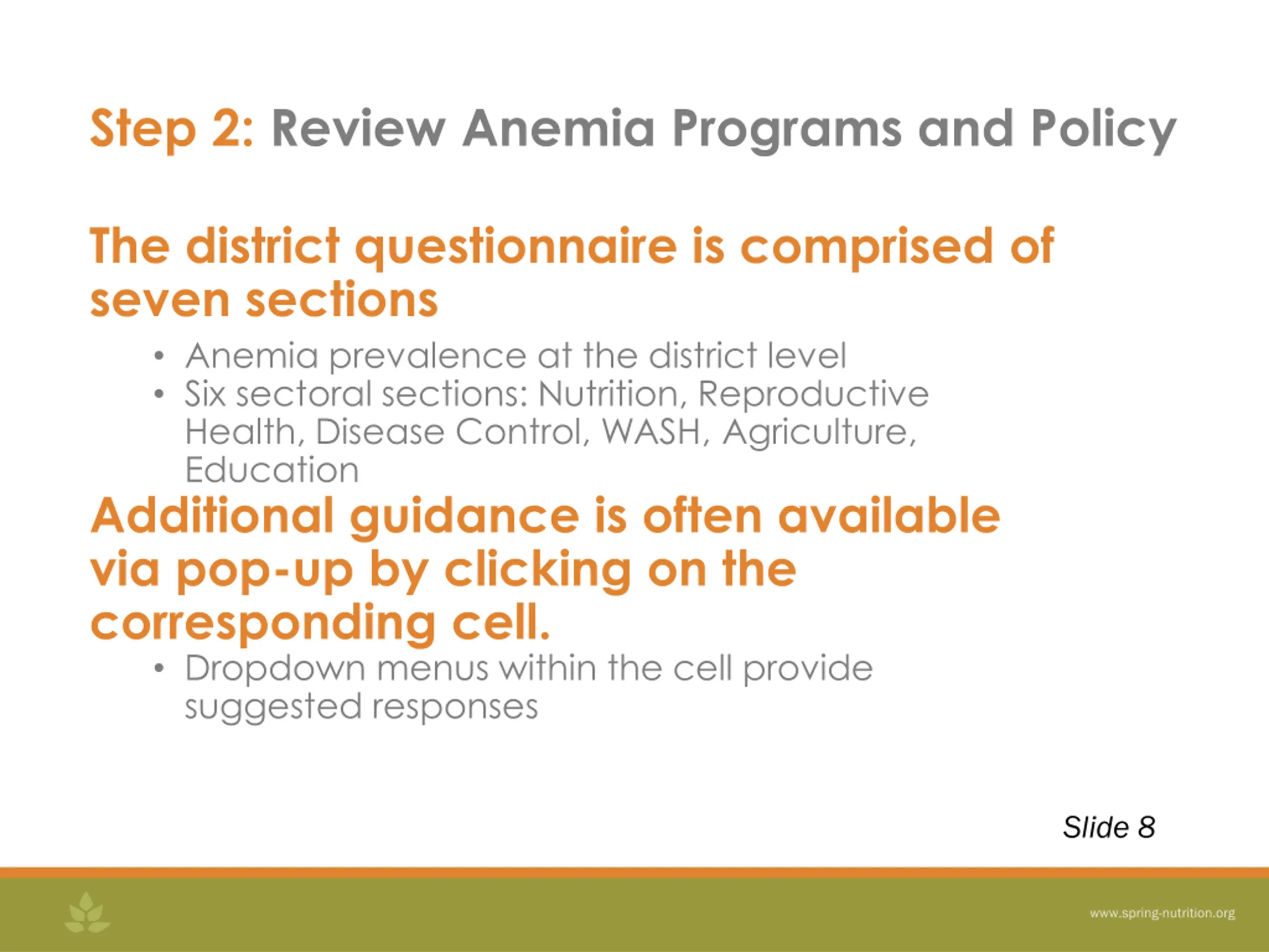 Step 2: Review Anemia Programs and Policy The district questionnaire is comprised of seven sections Anemia prevalence at the district level Six sectoral sections: Nutrition, Reproductive Health, Disease Control, WASH, Agriculture, Education Additional guidance is often available via pop-up by clicking on the corresponding cell. Dropdown menus within the cell provide suggested responses Slide 8