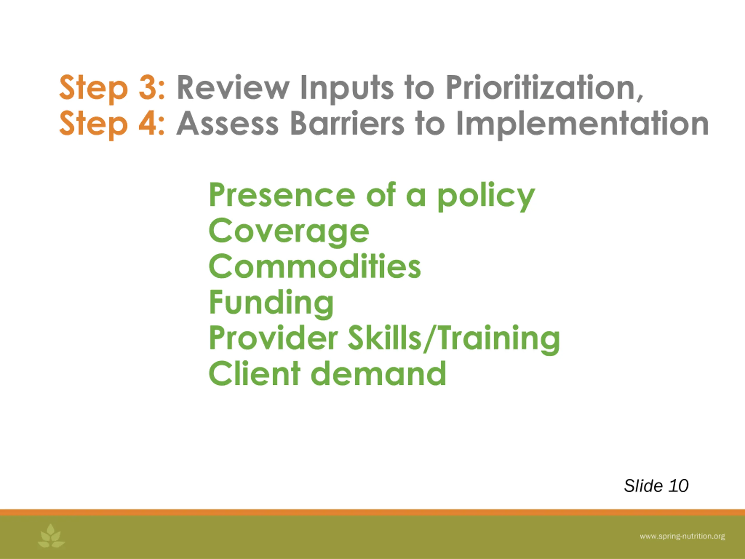 Step 3: Review Inputs to Prioritization, Step 4: Assess Barriers to Implementation Presence of a policy Coverage Commodities Funding Provider Skills/Training Client demand Slide 10