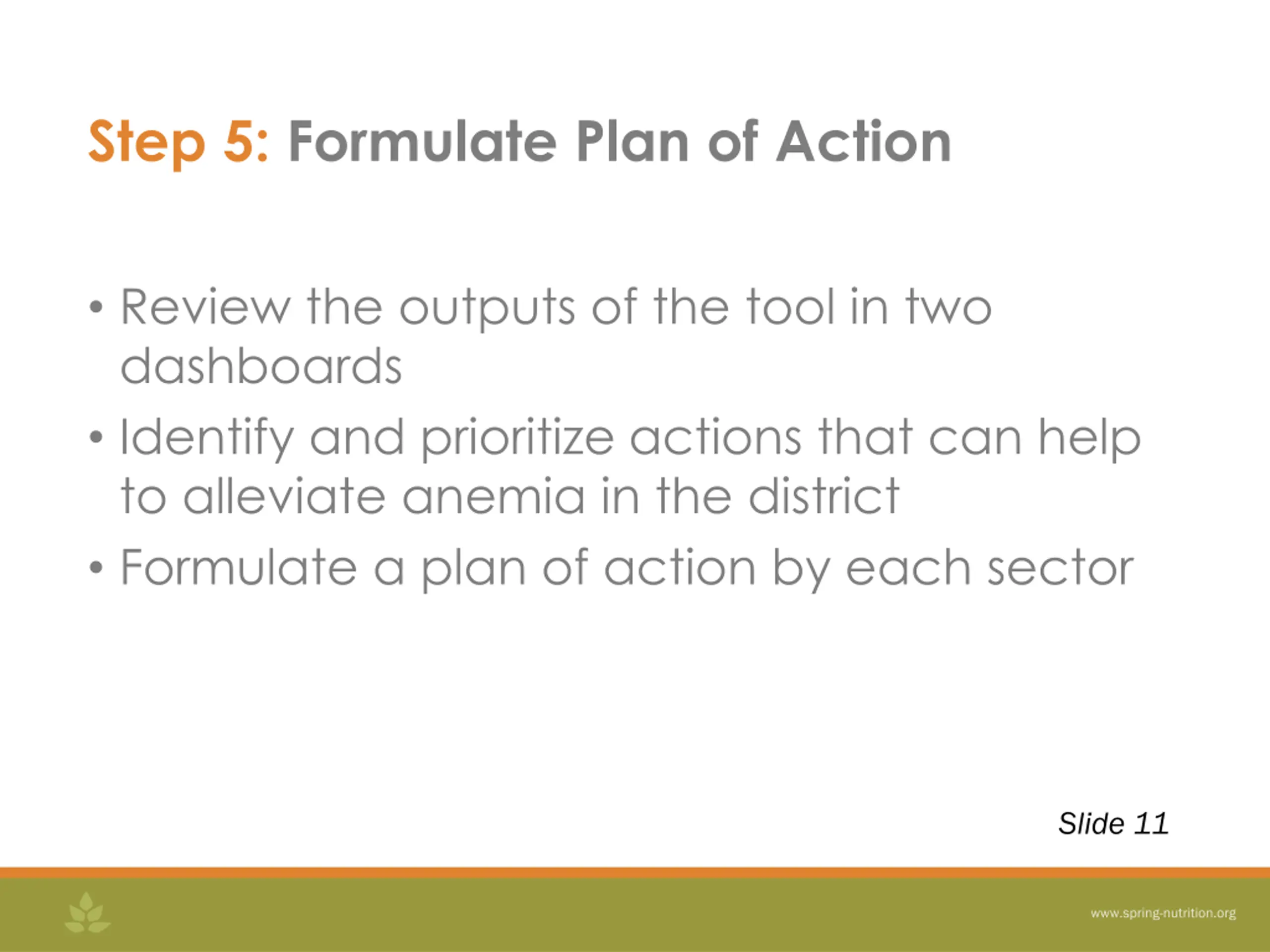 Step 5: Formulate Plan of Action Review the outputs of the tool in two dashboards Identify and prioritize actions that can help to alleviate anemia in the district Formulate a plan of action by each sector Slide 11