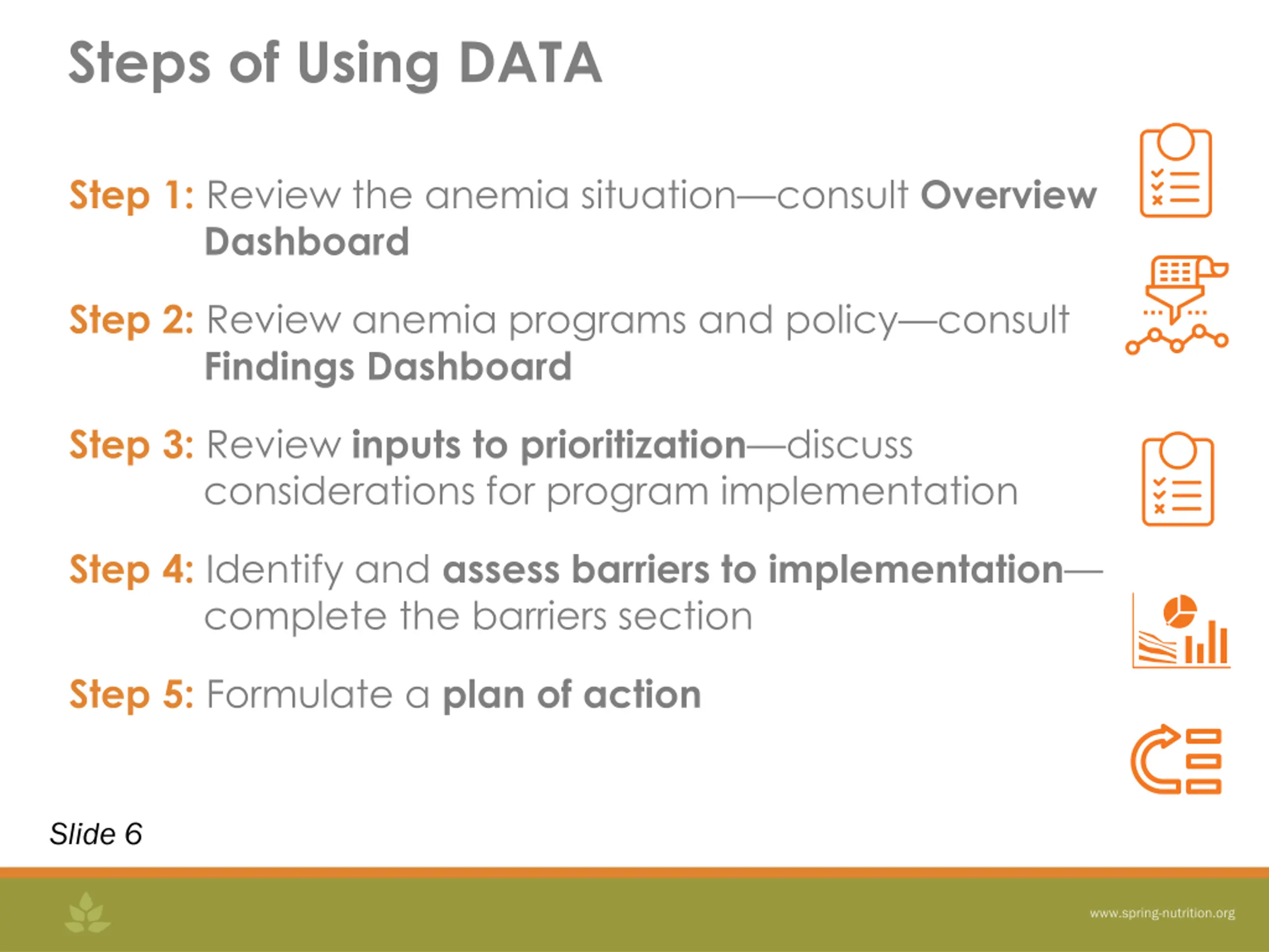 Steps of Using DATA Step 1: Review the anemia situation consult Overview Dashboard Step 2: Review anemia programs and policy consult Findings Dashboard Step 3: Review inputs to prioritization discuss considerations for program implementation Step 4: Identify and assess barriers to implementation complete the barriers section Step 5: Formulate a plan of action Slide 6