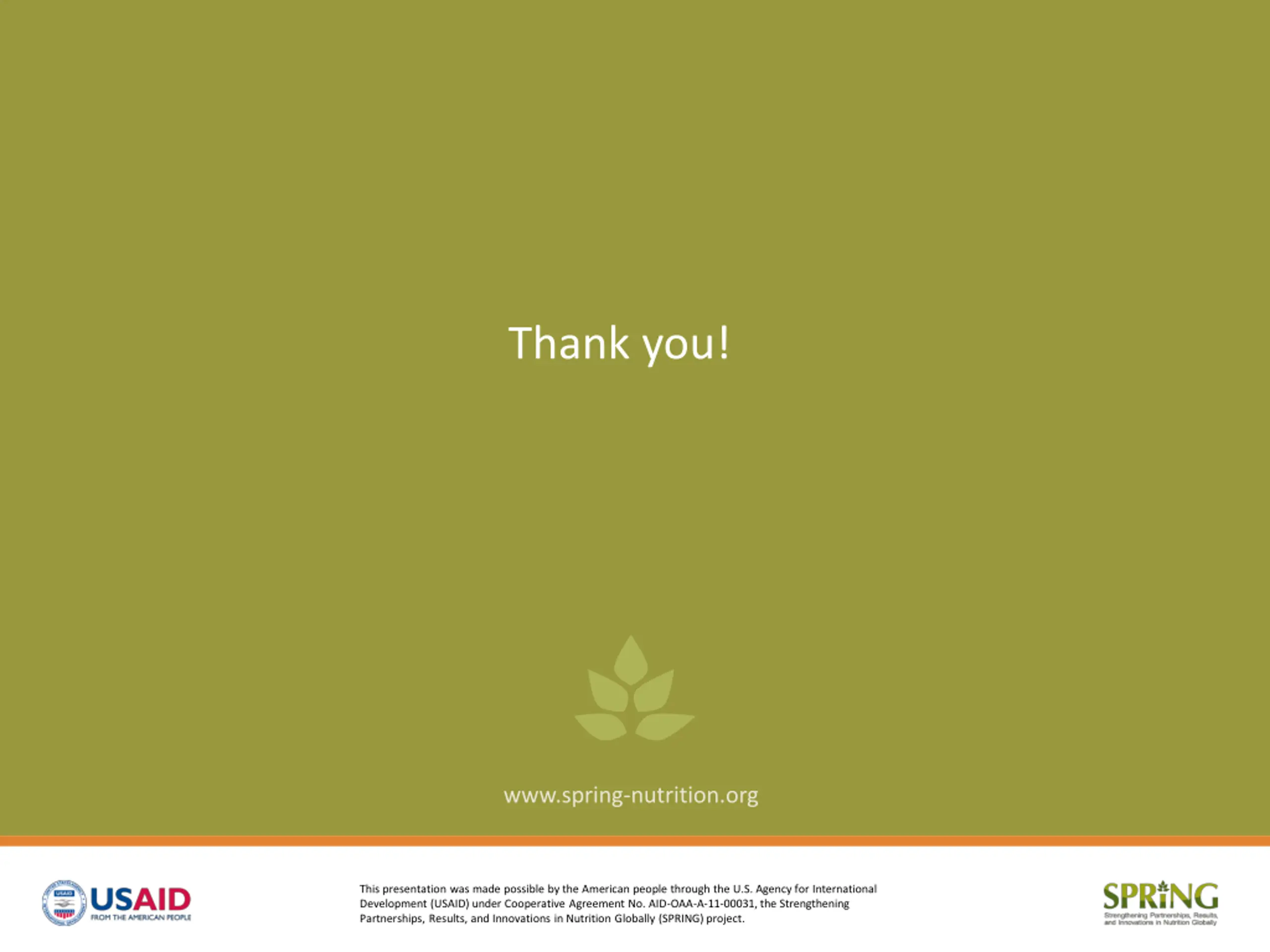 Thank you! This presentation was made possible by the American people through the U.S. Agency for International Development (USAID) under Cooperative Agreement No. AID-OAA-A-11-00031, the Strengthening Partnerships, Results, and Innovations in Nutrition Globally (SPRING) project.