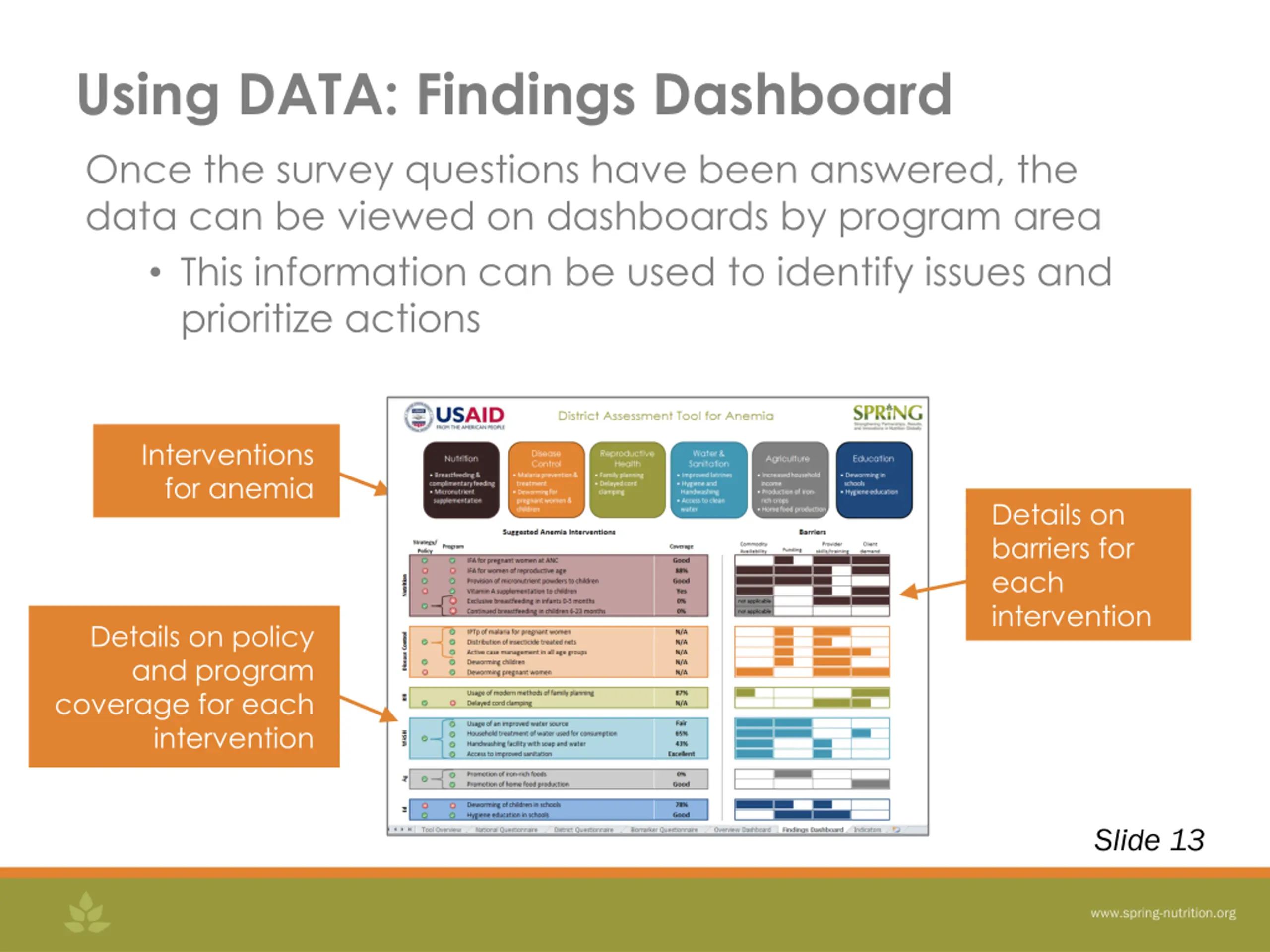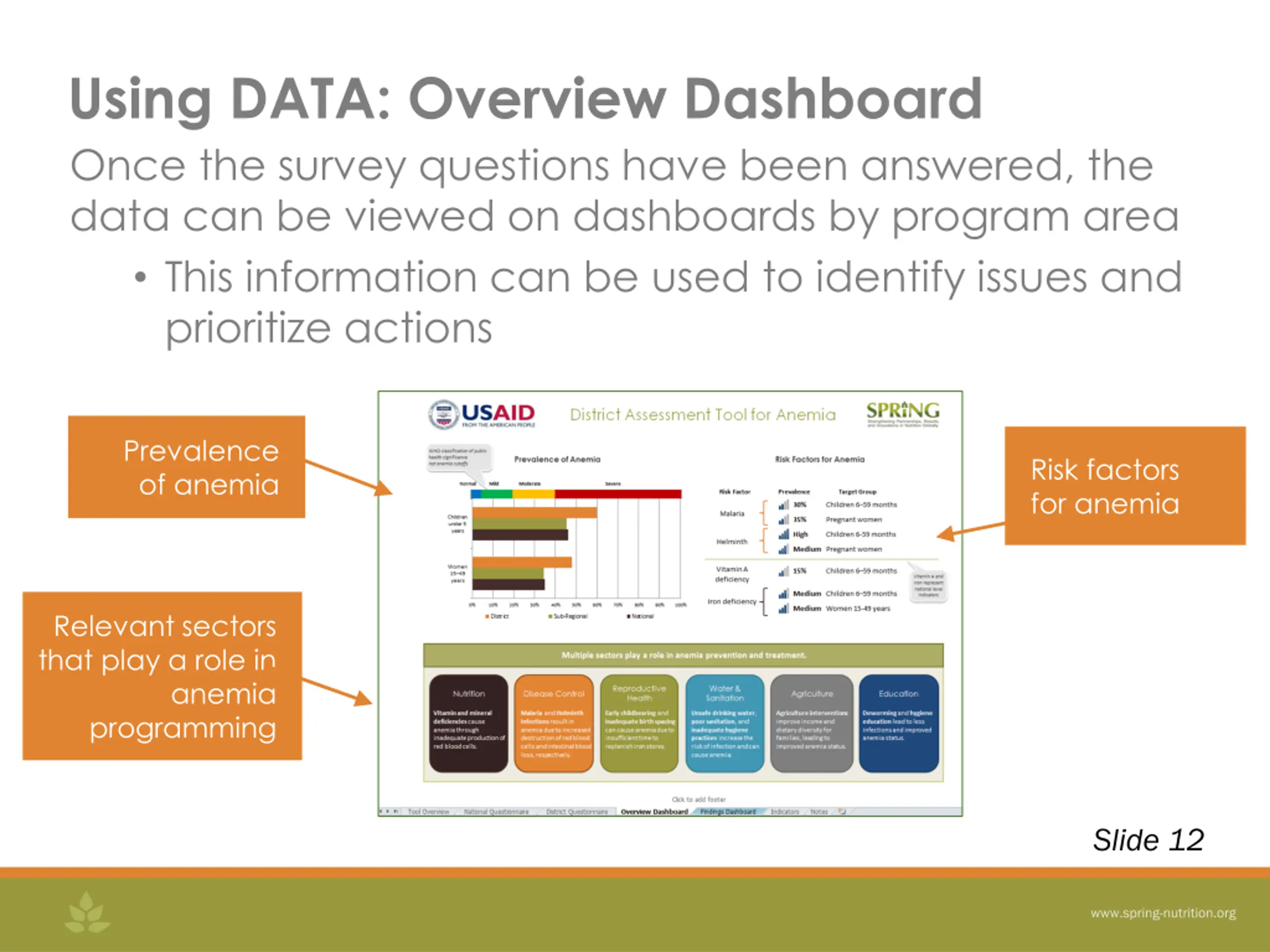 Using DATA: Overview Dashboard Once the survey questions have been answered, the data can be viewed on dashboards by program area This information can be used to identify issues and prioritize actions Prevalence of anemia Risk factors for anemia Relevant sectors that play a role in anemia programming Slide 12