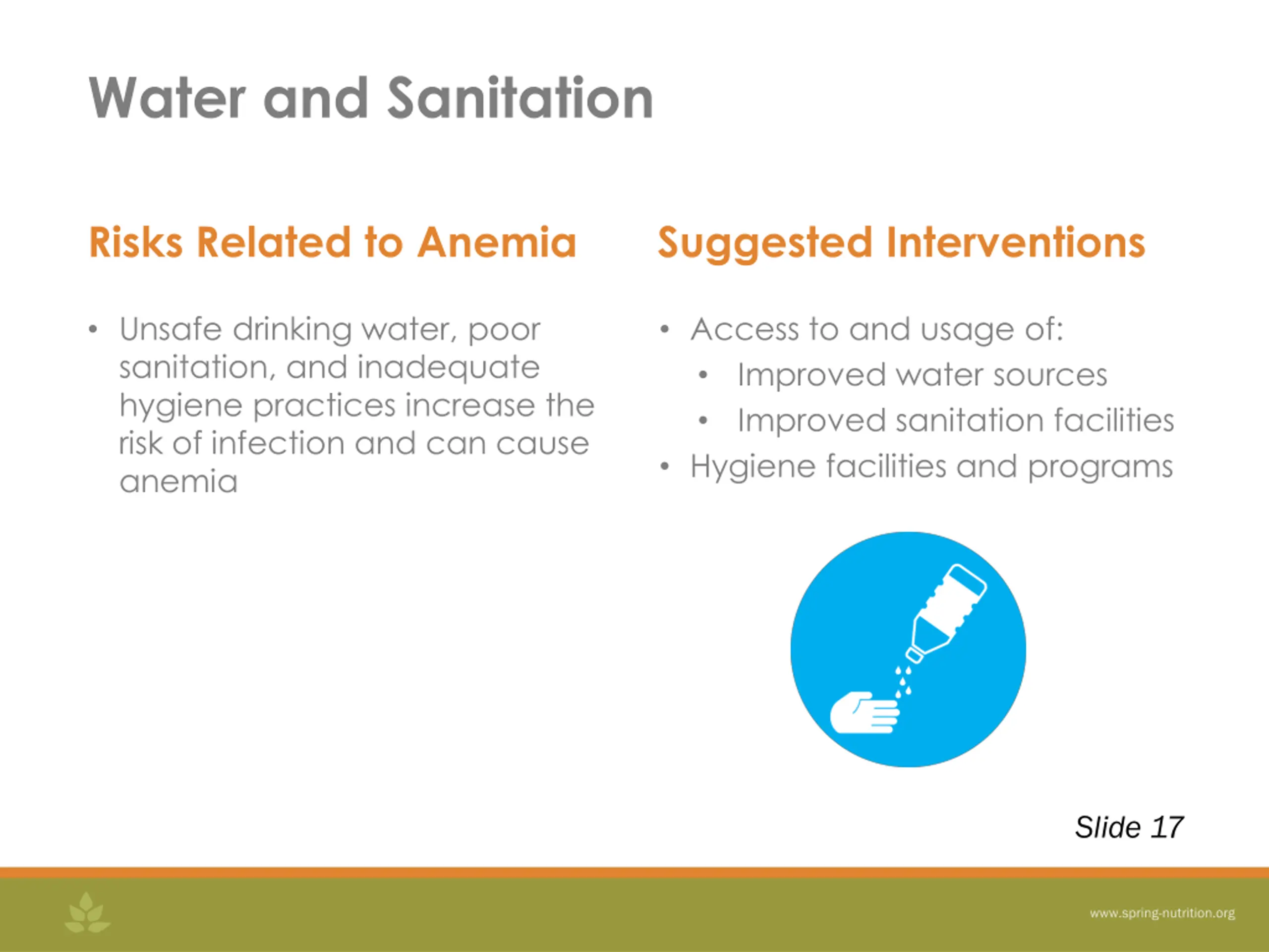 Water and Sanitation Risks Related to Anemia Suggested Interventions Unsafe drinking water, poor sanitation, and inadequate hygiene practices increase the risk of infection and can cause anemia Access to and usage of: Improved water sources Improved sanitation facilities Hygiene facilities and programs Slide 17