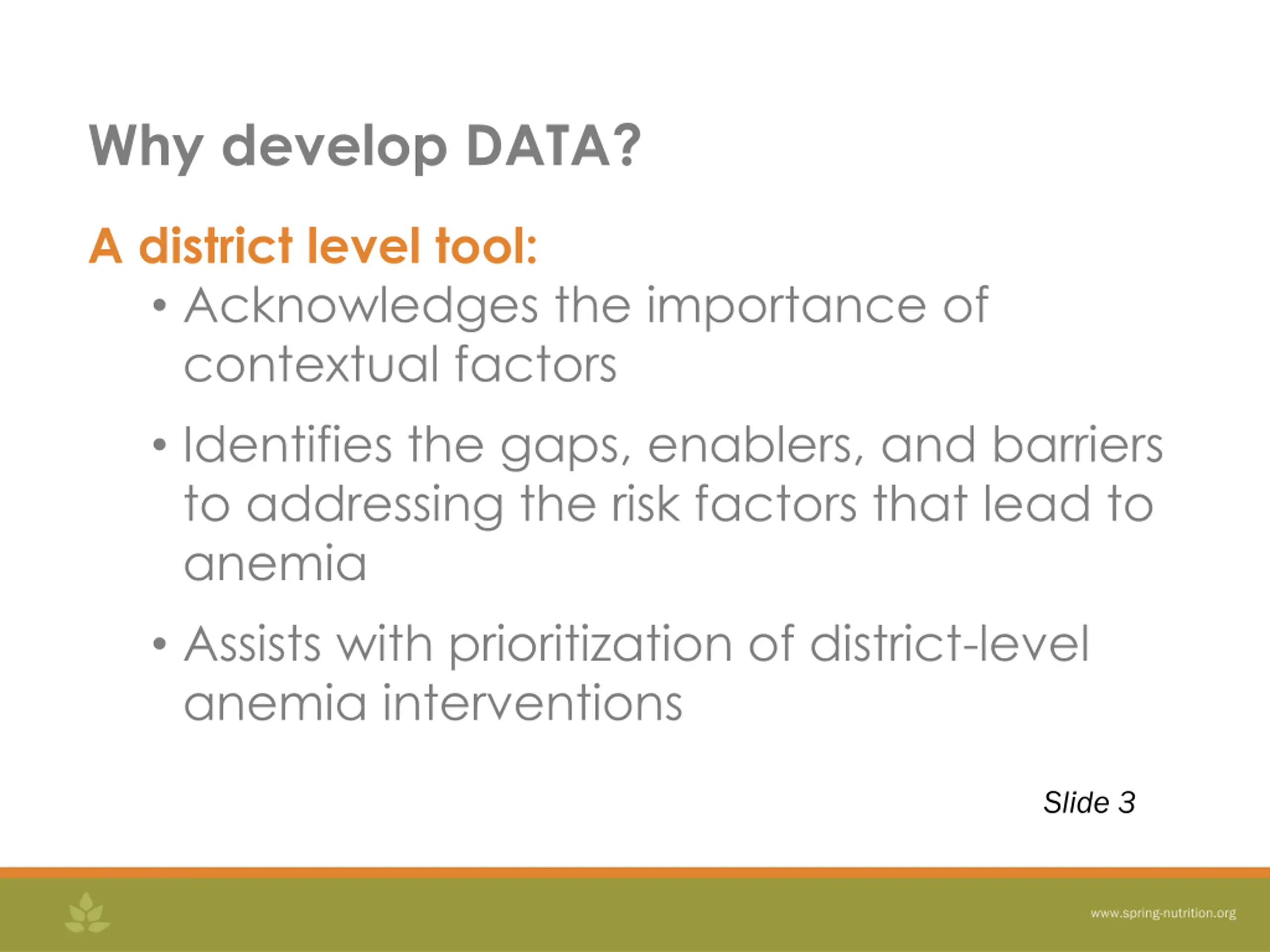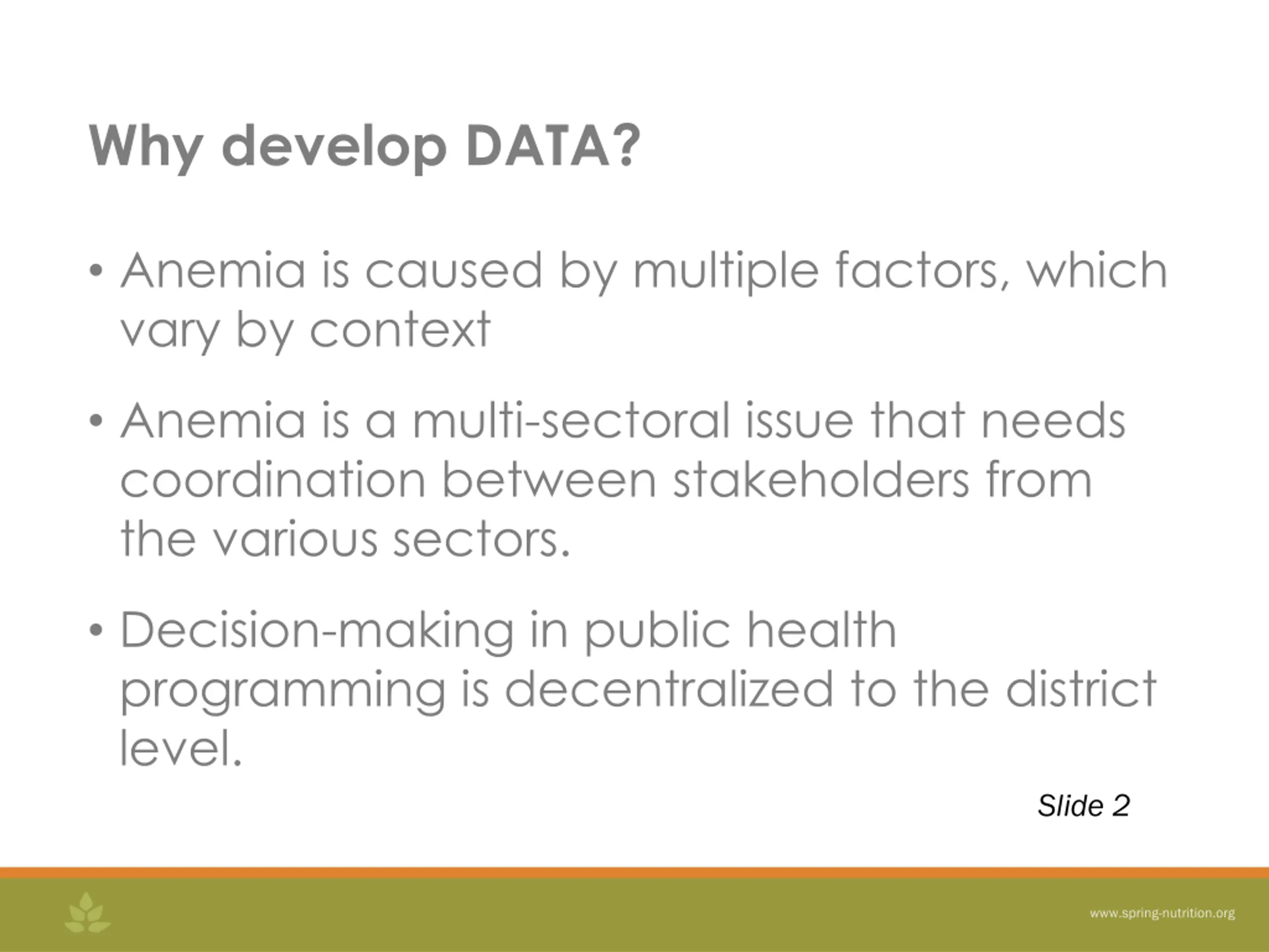 Why develop DATA? Anemia is caused by multiple factors, which vary by context Anemia is a multi-sectoral issue that needs coordination between stakeholders from the various sectors. Decision-making in public health programming is decentralized to the district level. Slide 2