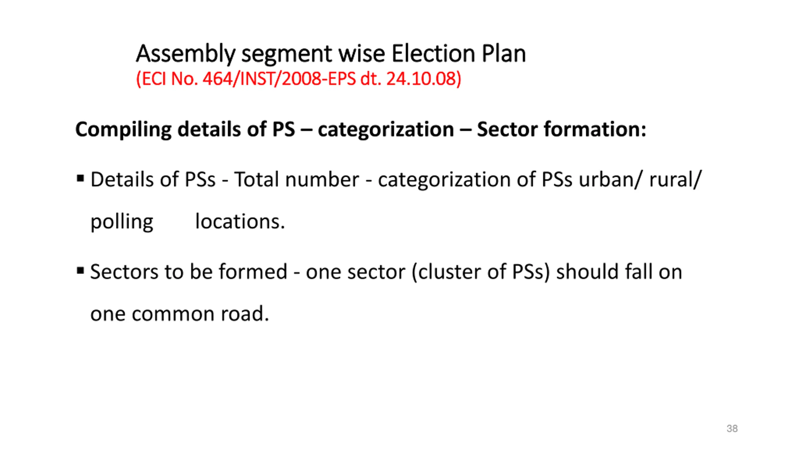 Assembly segment wise Election Plan Assembly segment wise Election Plan (ECI No. 464/INST/2008 (ECI No. 464/INST/2008- -EPS dt. 24.10.08) EPS dt. 24.10.08) Compiling details of PS categorization Sector formation: Details of PSs - Total number - categorization of PSs urban/ rural/ polling locations. Sectors to be formed - one sector (cluster of PSs) should fall on one common road. 38