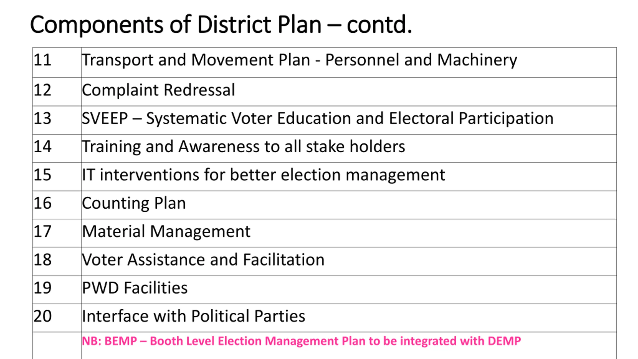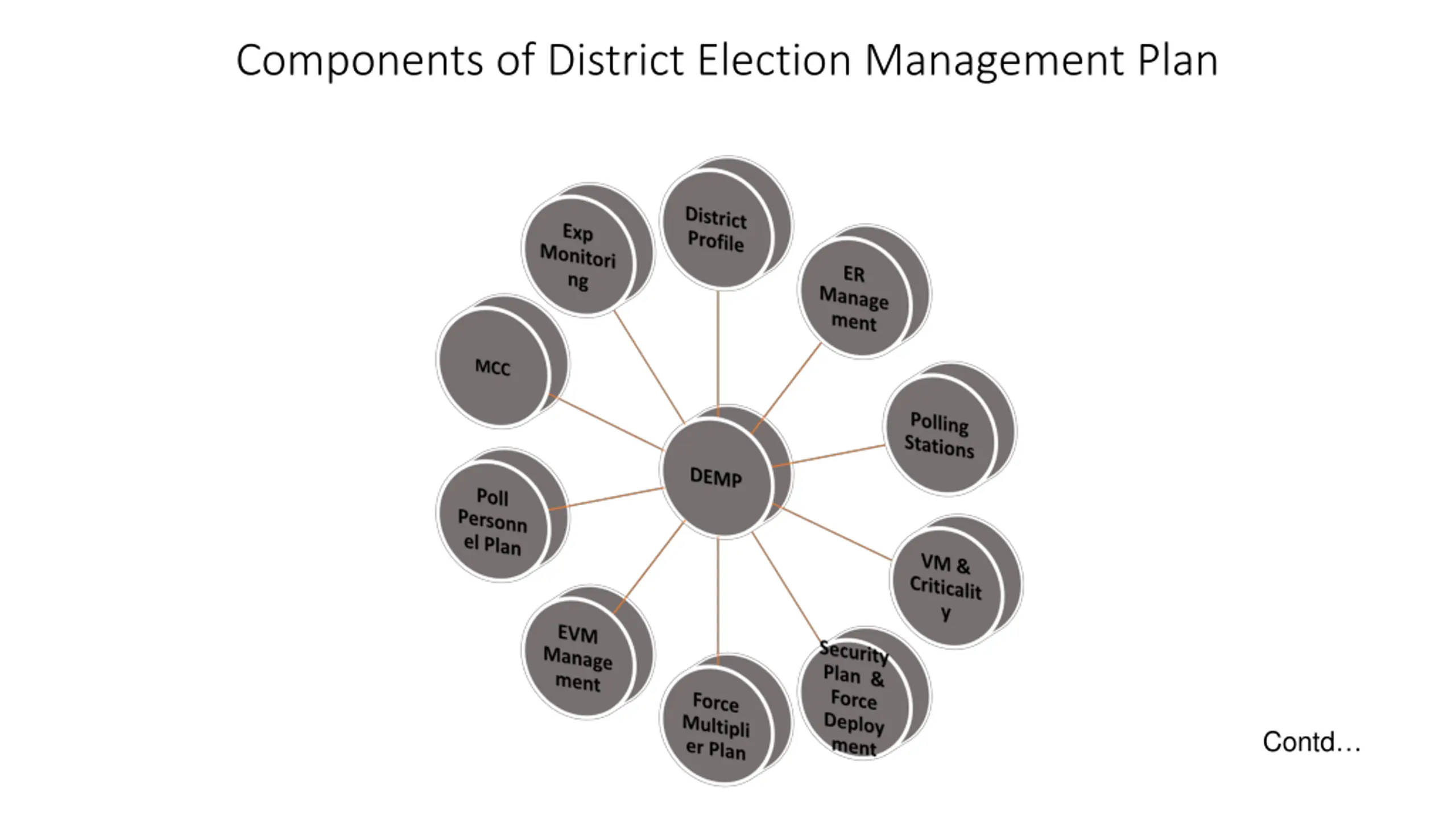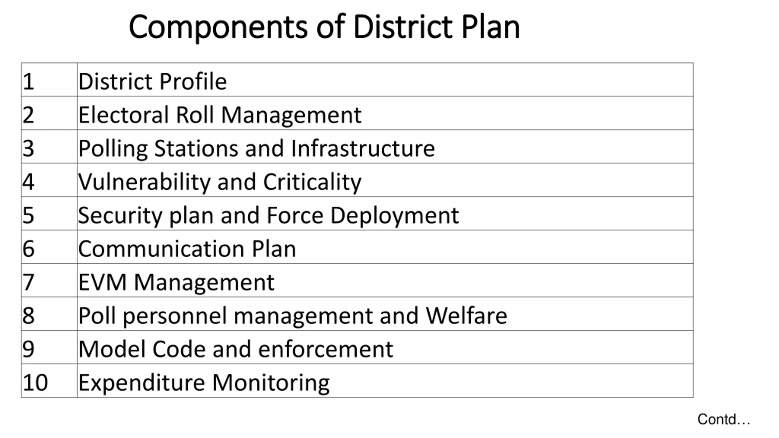 Components of District Plan Components of District Plan 1 2 3 4 5 6 7 8 9 10 District Profile Electoral Roll Management Polling Stations and Infrastructure Vulnerability and Criticality Security plan and Force Deployment Communication Plan EVM Management Poll personnel management and Welfare Model Code and enforcement Expenditure Monitoring Contd