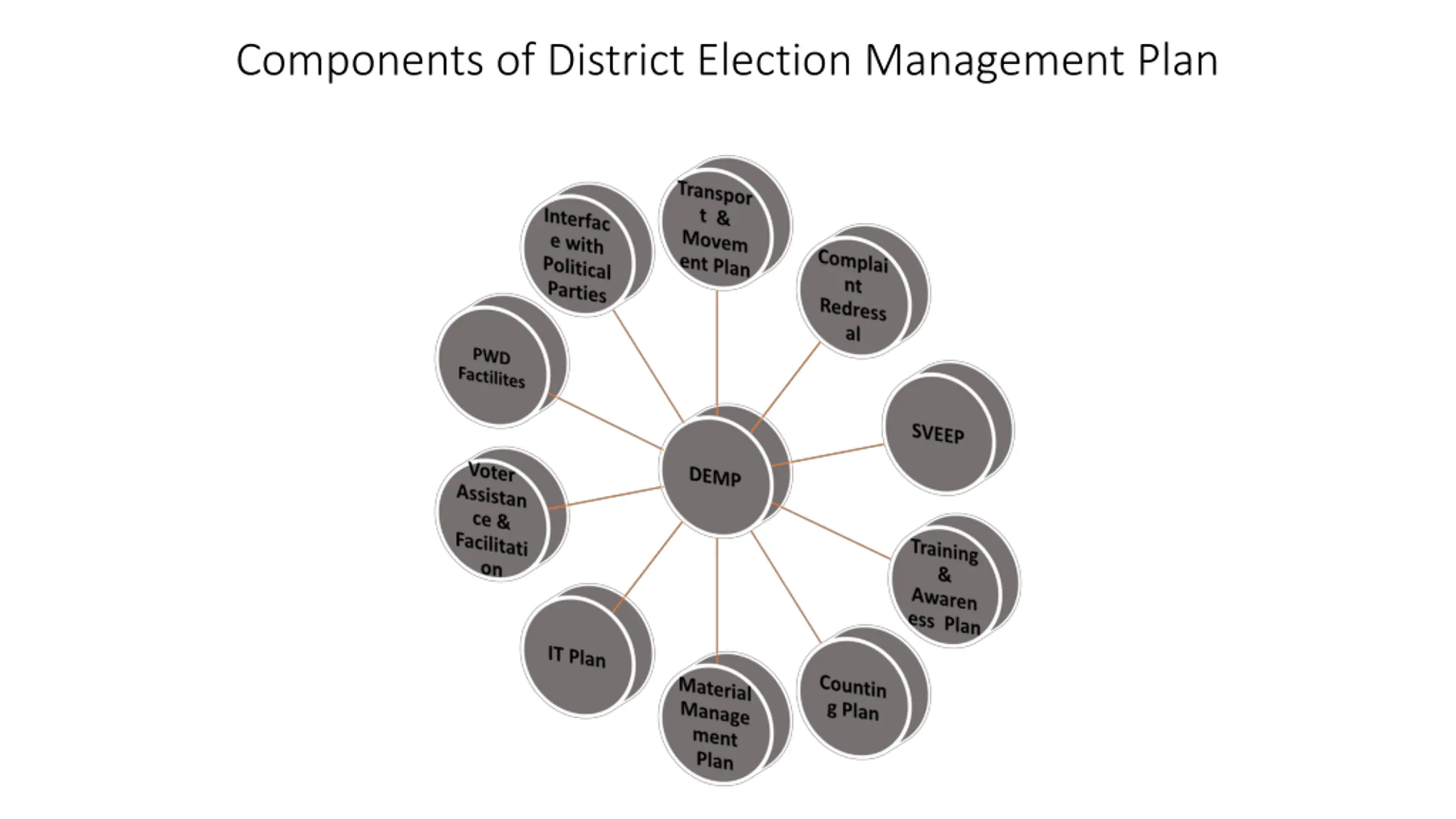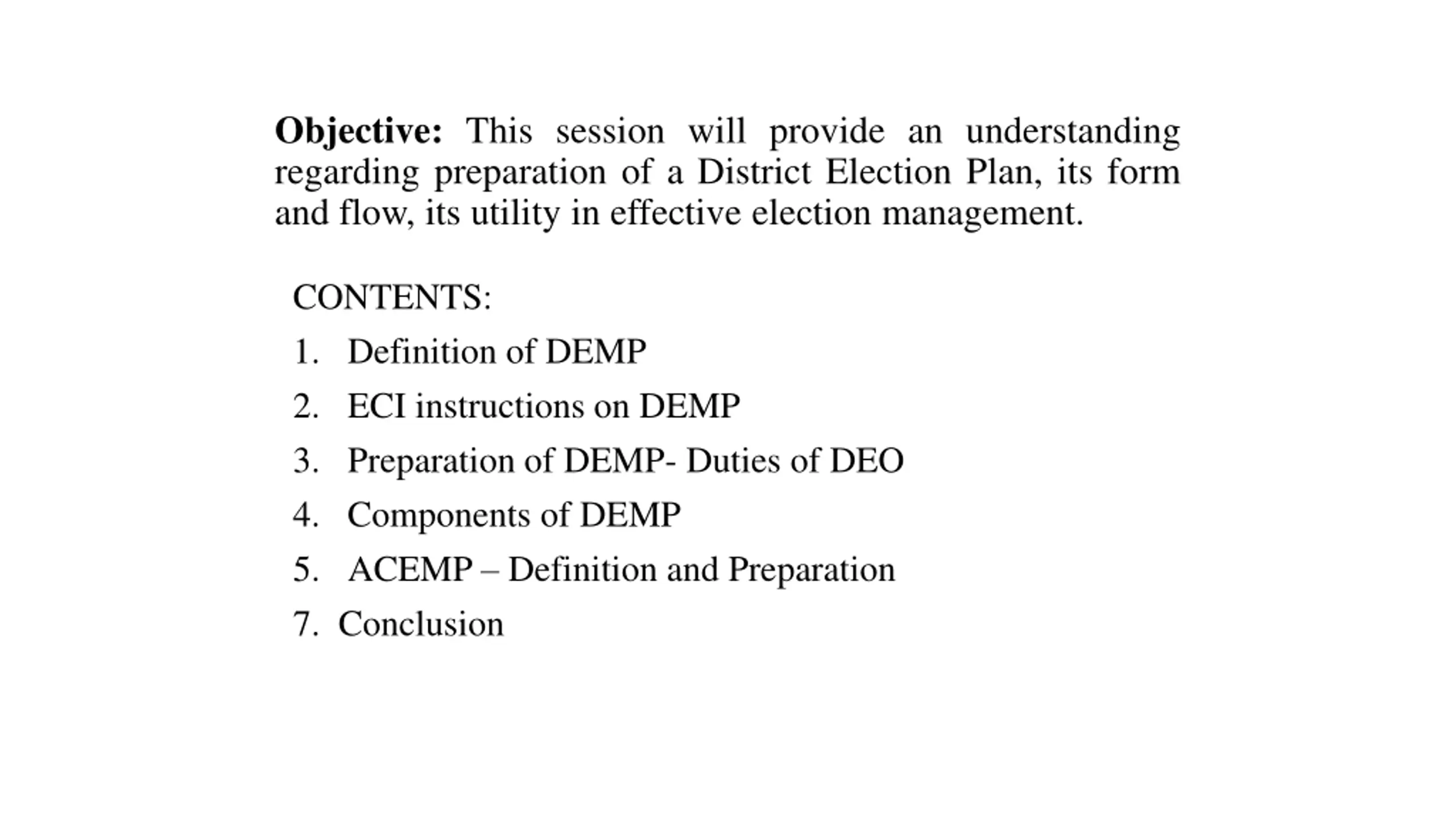 Objective: This session will provide an understanding regarding preparation of a District Election Plan, its form and flow, its utility in effective election management. CONTENTS: 1. Definition of DEMP 2. ECI instructions on DEMP 3. Preparation of DEMP- Duties of DEO 4. Components of DEMP 5. ACEMP Definition and Preparation 7. Conclusion