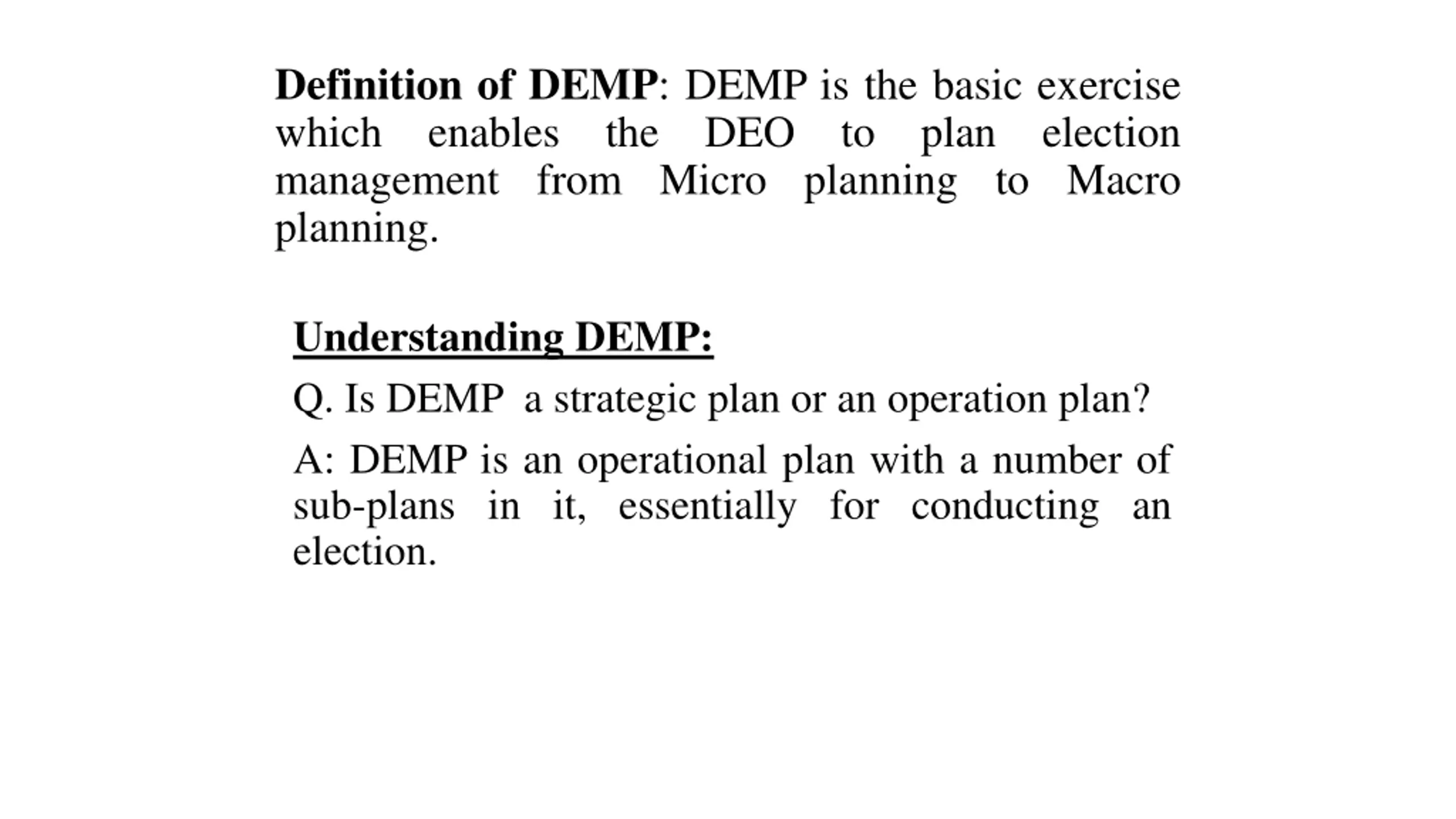 Definition of DEMP: DEMP is the basic exercise which enables the DEO to plan election management from Micro planning to Macro planning. Understanding DEMP: Q. Is DEMP a strategic plan or an operation plan? A: DEMP is an operational plan with a number of sub-plans in it, essentially for conducting an election.