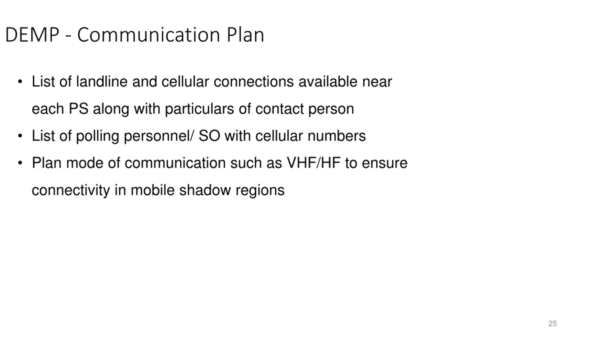 DEMP - Communication Plan List of landline and cellular connections available near each PS along with particulars of contact person List of polling personnel/ SO with cellular numbers Plan mode of communication such as VHF/HF to ensure connectivity in mobile shadow regions 25