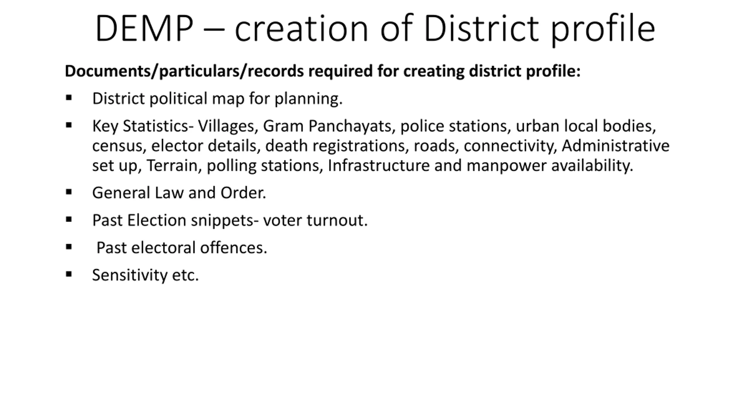 DEMP creation of District profile Documents/particulars/records required for creating district profile: District political map for planning. Key Statistics- Villages, Gram Panchayats, police stations, urban local bodies, census, elector details, death registrations, roads, connectivity, Administrative set up, Terrain, polling stations, Infrastructure and manpower availability. General Law and Order. Past Election snippets- voter turnout. Past electoral offences. Sensitivity etc.